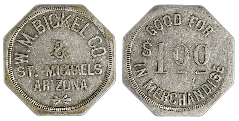 Obverse: W.M. Bickel Co. / St. Michaels / Arizona; reverse: Good For $1.00 / In Merchandise. Al, 37mm, R10. Very fine condition.