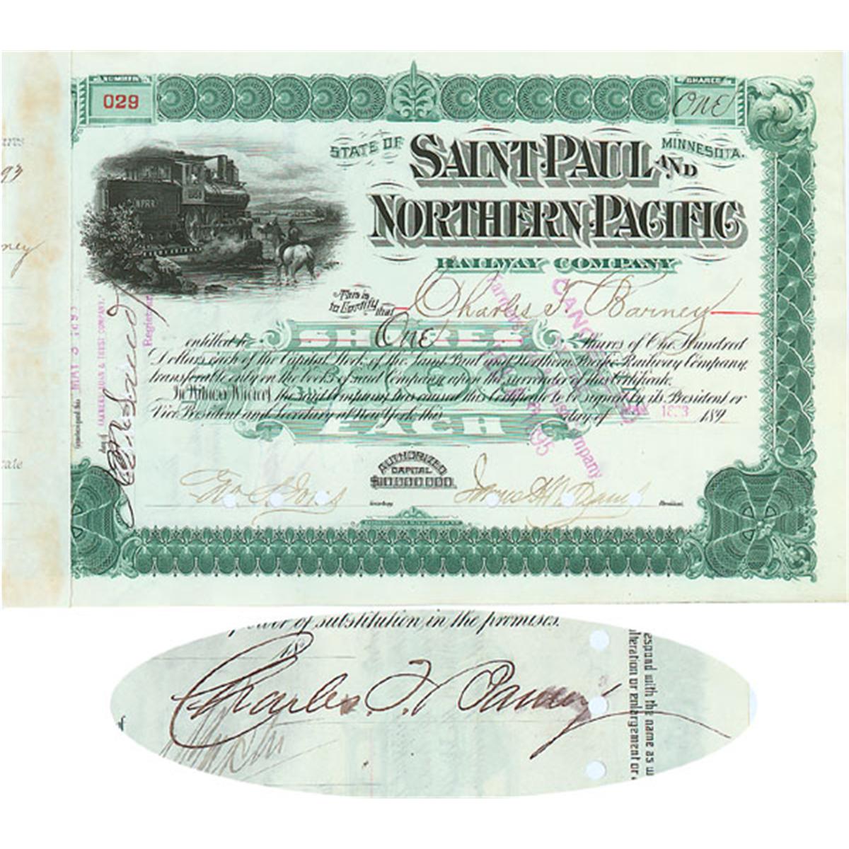 1893, Minnesota. Stock certificate issued to and signed on verson by Charles T. Barney. Green/Black. Vignette of a steam locomotive passing a man on horseback. Engraved. Punch and stamp cancelled and Excellent.