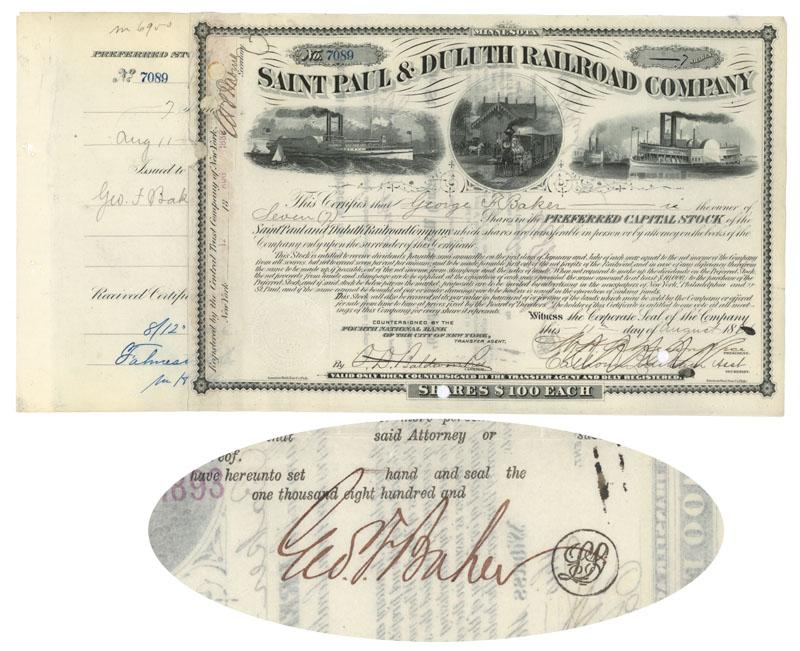 1886, Minnesota. Stock certificate for seven shares issued to and signed on verso by GEORGE F. BAKER (1840-1931). Banker; Philanthropist. Starting as a clerk in New York state's banking department in 1856, the clever and industrious Baker quickly came to the notice of many of the state's prominent bankers. By 1863, he had been lured from state employment, and was one of the founders of the First National Bank of New York, a bank that would become the most prominent of all banks under the new national banking system. During the Panic of 1873, he was largely responsible for keeping the bank afloat, and it was during this period that the bank began to more fully adopt Baker's philosophy and become a "banker's bank." Baker became the bank's second president in 1877, and aggressively continued the bank's policy of developing connections with great business corporations, both in the U.S. and overseas. A man of boundless energy, Baker sat on the boards of many corporations in a wide variety of industries, at one point sitting on some 87 boards simultaneously. At its height, his fortune was estimated at some $200 million but, at his death, after many years of donations to schools, libraries, museums, hospitals, churches, etc. his estate was valued at a mere $73.5 million. Black / White. Vignette of a train pulling into a station with Vignettes of steamships at left and right at top center. Blind embossed company seal. Punch and pen cancellations does not affect Baker’s signature. Overall Very Fine.