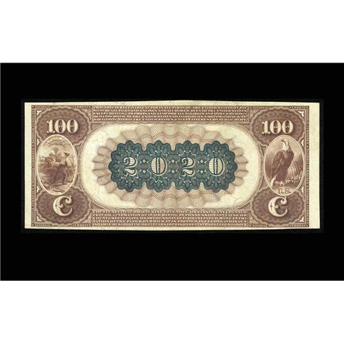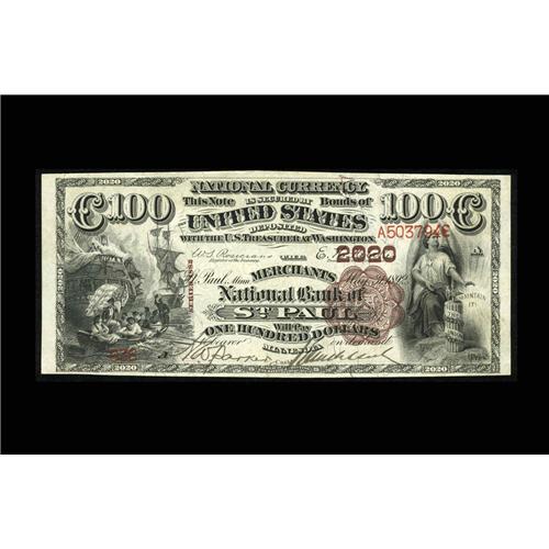 <B>Saint Paul, MN</B></I> - $100 1882 Brown Back Fr. 525 <B>The Merchants NB</B></I> Ch. # 2020<BR>This classic rarity is one of the most significant Nationals offered in this sale. It comes from a state where any large hundred would represent a major discovery, as the census reveals only one First Charter, four Brown Backs, no Second Charter Date Backs, and no Third Charter specimens of any kind. This specimen is one of the four reported Brown Backs, and the only one to have a listed grade above Very Good. It comes from an old collection and has been off the market for many years. When last catalogued, it was graded as Choice CU. It is utterly original, brilliantly colored, and fully embossed, with great pen signatures, but there is a single fold that is easy to overlook unless the note is examined quite carefully. Regardless of its technical grade, it remains a major Minnesota rarity and a gorgeous example truly fit for the finest of collections. <B>Choice About Uncirculated.</B></I>