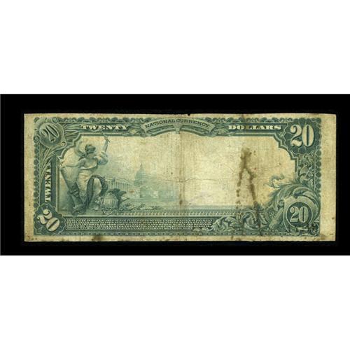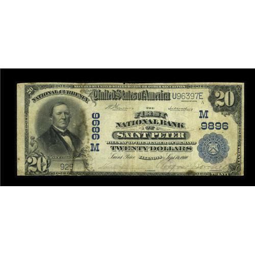 <B>Saint Peter, IL</B></I> - $20 1902 Plain Back Fr. 653 <B>The First NB</B></I> Ch. # (M)9896<BR>This is one of only 8 large for this bank. There is also some staining. A small internal split affects the last digit in the bank serial number. The president's signature is darker than the cashier's. <B>Very Good.</B></I><BR><I>From The Lincoln Collection</B></I><BR><BR><b>Shipping:</b> Coins & Currency (<a target="_blank" href="http://www.heritageauctions.com/common/shipping.php">view shipping information</a>)