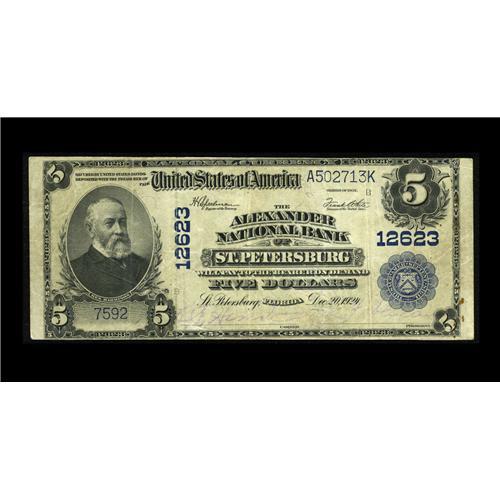 <B>Saint Petersburg, FL</B></I> - $5 1902 Plain Back Fr. 609 <B>The Alexander NB</B></I> Ch. # 12623<BR>Only eight serial numbers are recorded in the census for this bank and that includes this note. This short-lived Pinellas County bank kept its doors open for less than three years. The purple stamped signatures are partially visible while the right-hand margin exhibits a little bit of rust. <B>Very Fine.</B></I><BR><BR><b>Shipping:</b> Coin/Currency (<a target="_blank" href="http://www.heritageauctions.com/common/shipping.php">view shipping information</a>)
