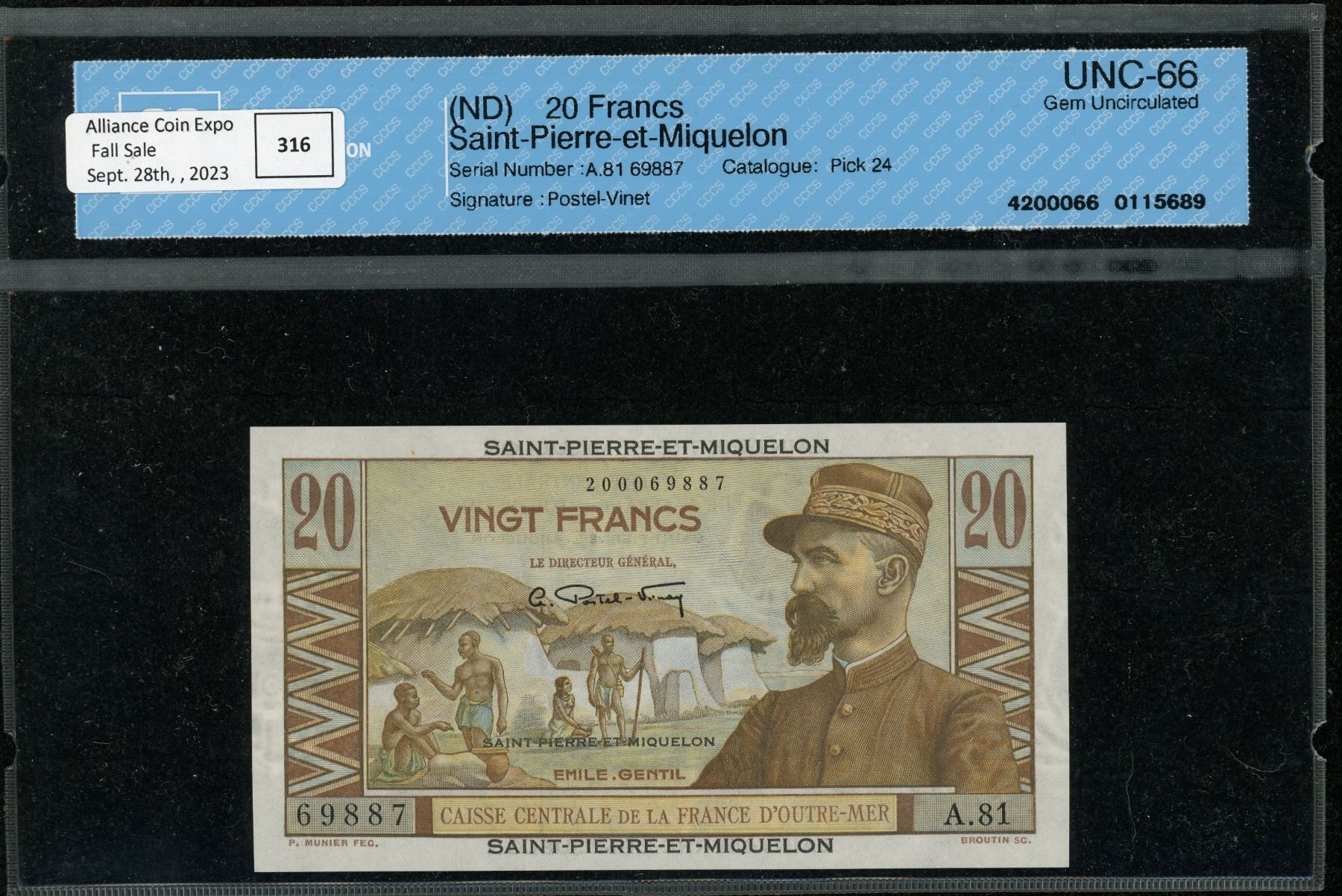 Saint Pierre et Miquelon 20 Francs (1950-1960) P.25, #A.81 69887, CCCS Gem Uncirculated 66