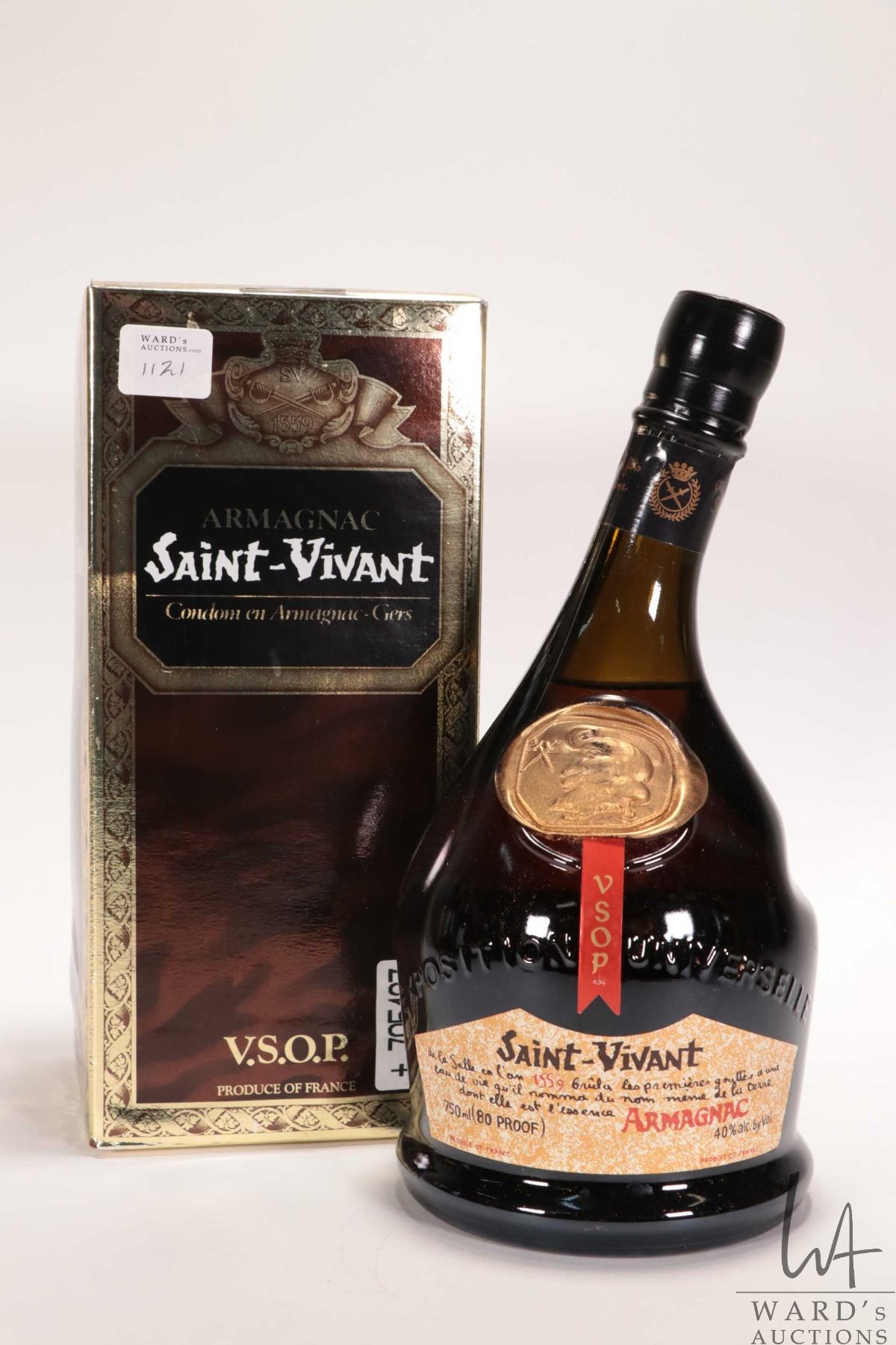 Saint-Vivant/ V.S.O.P. Armagnac/ 750ml/ 40% ABV/ Includes original box Note: Alcohol cannot be insured by any courier in Canada. Local pick up is recommended. Canadian bidders only.