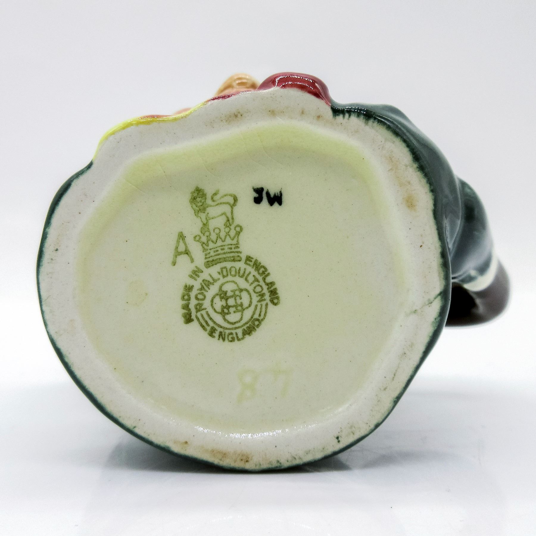 Black hair; light green band; dark green coat; yellow and burgundy bow. In Charles Dickens' 1843 novel, "Martin Chuzzlewit" Sairey Gamp is a gossiping, gin-drinking midwife and nurse.