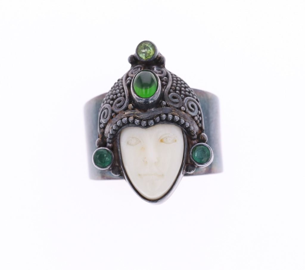 Featured in this lot is this Sajen emerald and citrine cameo ring collection. There are two rings in this collection. The rings are wonderfully and professionally crafted steel, emerald, citrine, brass, and cameo shell construction. The first ring is shows a steel ring frame with three emerald cabochon set into the face and a citrine gemstone set into the top of the face with a cameo shell figural face and a steel hood; the ring is marked as follows: Sajen. The second ring shows a brass ring frame with a cameo shell moon face with stars set into the face of the ring. The condition of this pair of rings is good with no obvious signs of damage and shows good overall condition. The measurements of this pair of rings is US 1 1/8" x 1 1/8" x 3/4" and the ring size is 10 1/4; and the second ring measures 1 1/4" x 7/8" x 1 1/8" and the ring size is US 10". The collective weight of this collection of rings is 31.3g.