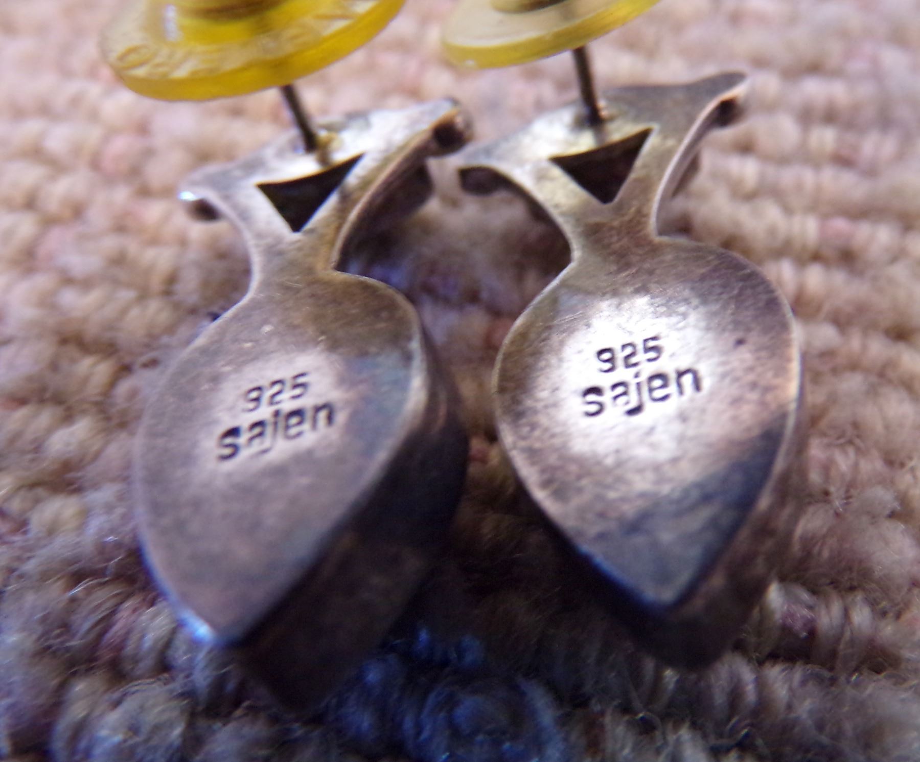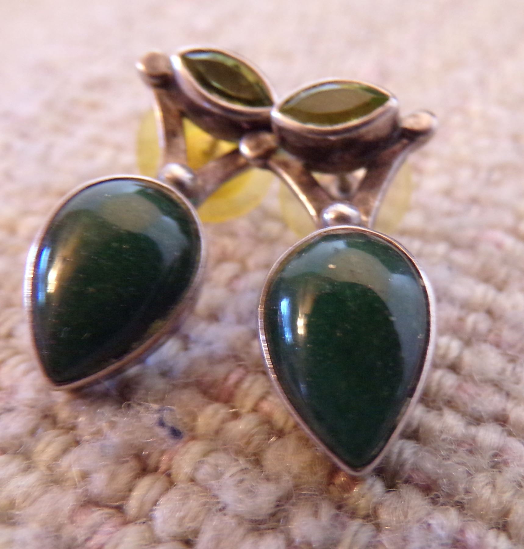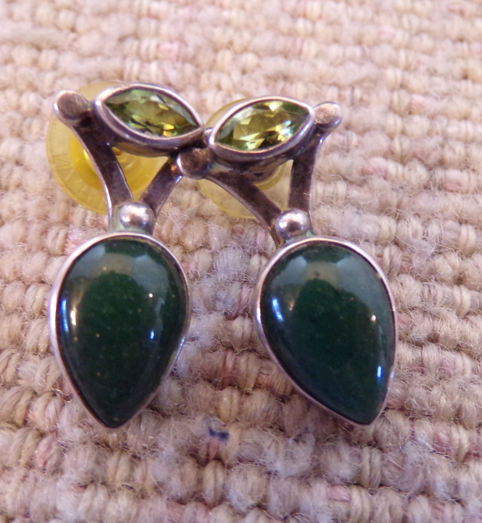 Sajen Sterling Jade and Peridot Post Earrings, measure 1''L x 3/8''W, hallmarked and stamped .925