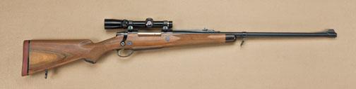 Sako .375 H&H caliber, bolt action sporting rifle, showing claw extractor, African type raised sight rib, folding rear sight, quick detachable sling swivels, checkered wood stock with metal bolt reinforcements, serial #540194 with Stoeger import marks. The rifle is in fine to excellent condition, some minor storage marks, slight handling and use, 98-99%. From the Robert Petersen Collection. Est: $1,000 - $2,000