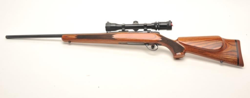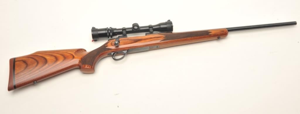 Sako A II bolt action rifle, .243 Win. caliber, 23” round barrel, blued finish, checkered laminated wood stock, S/N 368844, mounted with Burris Scope Chief VI scope displaying crisp optics. This rifle is inoverall excellent condition showing little if any use; barrel tapped for scope mounts. (Modern). Est.: $500-$1,000.