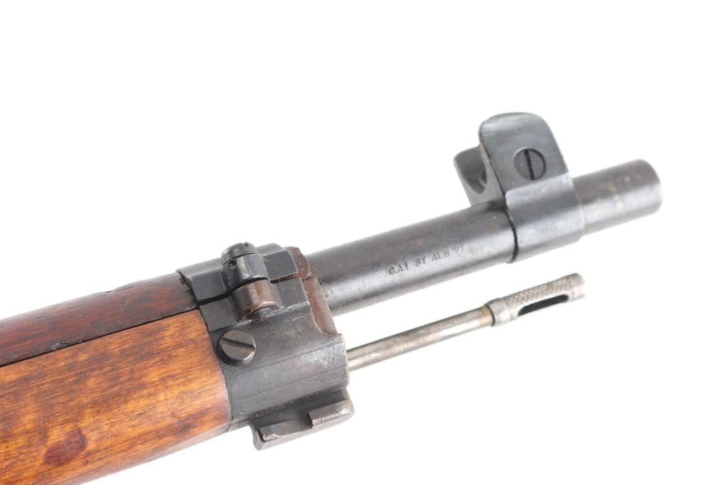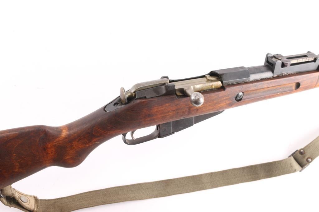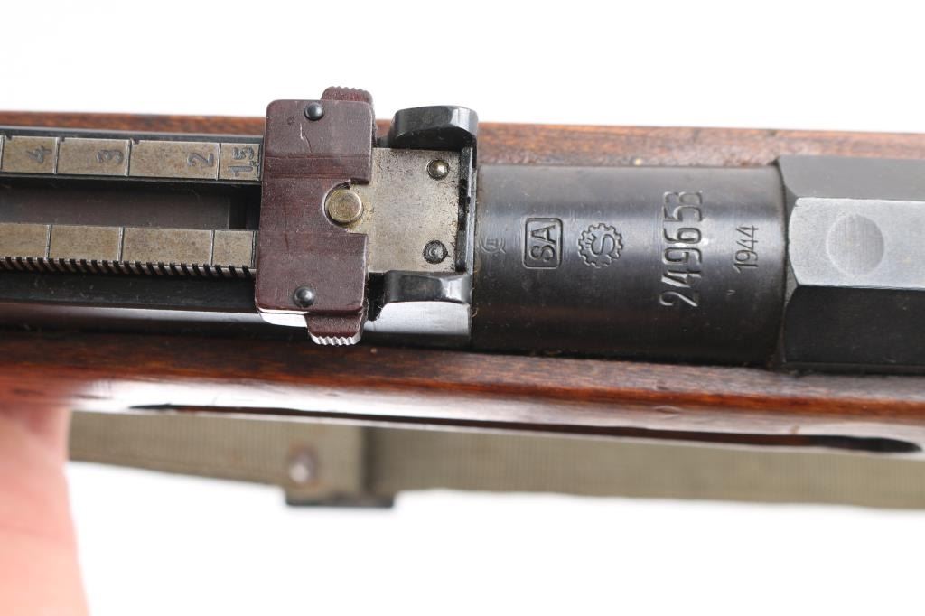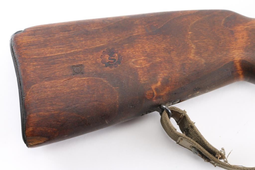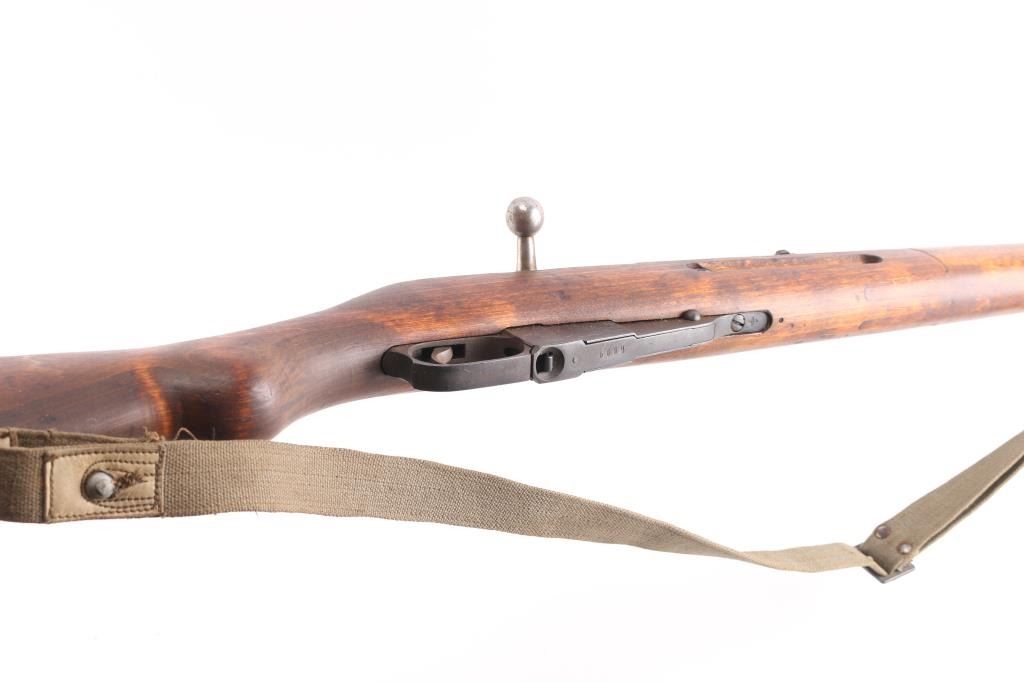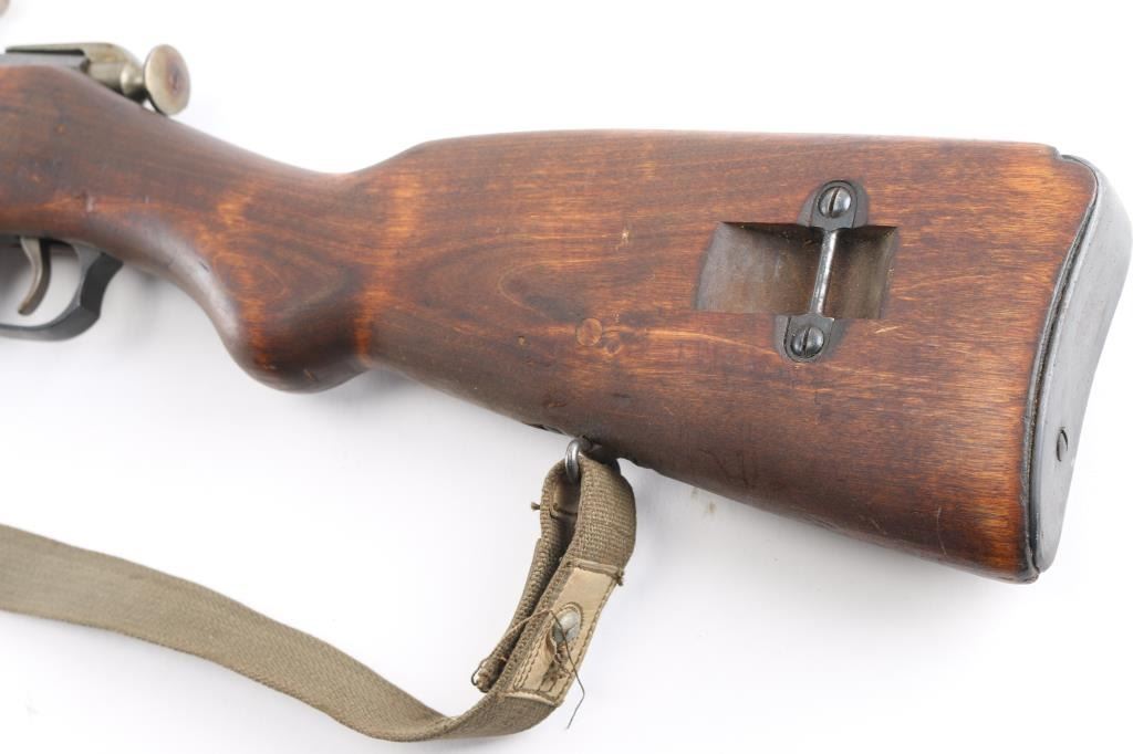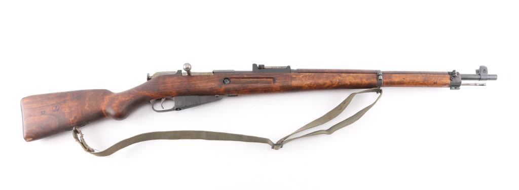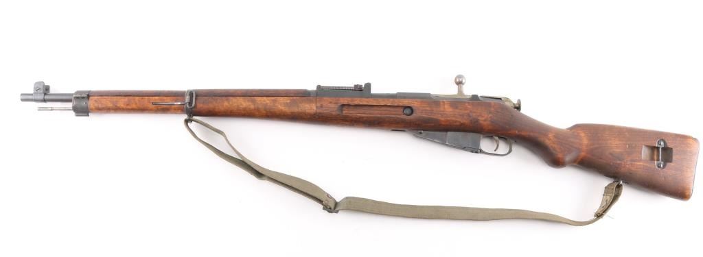 Finnish military bolt action rifle imported by century Arms Inc. Features 27" barrel, bayonet lug, blade front sight with protector ears, tangent rear sight, cleaning rod under barrel, sling swivels, straight bolt handle, semi pistol grip wood stock & matching wood handguard. Bore is very good with strong rifling. Retains 95% arsenal re-blue on metal parts with scratches & other handling marks. Bolt is bare metal, clean,with very light pitting on cocking piece & bolt knob. Sights painted for increased visi. Stock is very good, assembled with finger splice under rear sight, few light scratches, small chip at toe. Markings include "S" inside Gear logo, "SA" stamp. 'S' in gear stock cartouche, Serial number on barrel has been added to receiver. Magazine, and sight base mismatched, other parts unnumbered. Includes Finnish army green canvass sling
