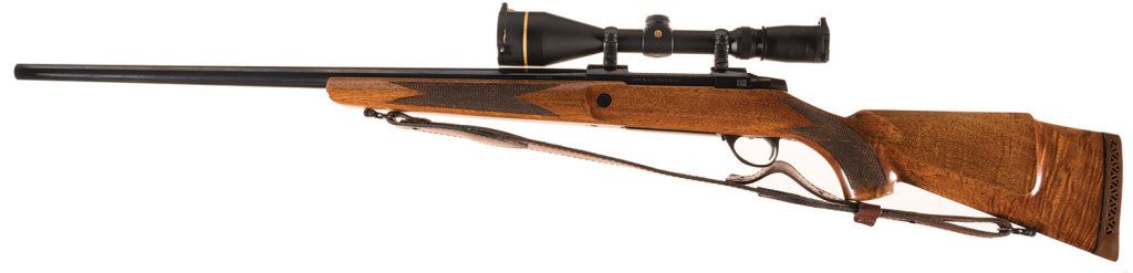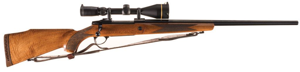Fitted with a Leupold VX-3 4.5-14x50mm scope, and leather sling.