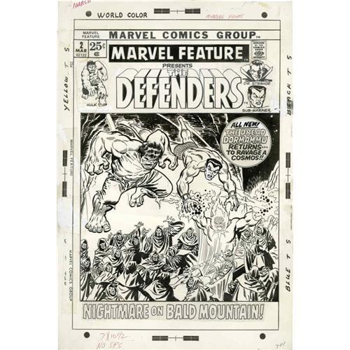 <B>John Buscema, John Romita Sr. and Frank Giacoia - Marvel Feature #2 The Defenders Cover (Marvel, 1972).</B></I> Here's a real <I>battle royale</B></I> -- the Hulk and the Sub-Mariner take on the dread Dormammu in this scene from "Nightmare on Bald Mountain." Meanwhile Dr. Strange lies comatose. This was only the second cover to feature the newly formed super-group, the Defenders. Marvel mainstays John Buscema and Frank Giacoia teamed to produce this Bronze Age milestone, and it looks as though John Romita Sr. may have had a hand in some art touch-ups to the Sub-Mariner's face. The cover has an image area of 10" x 15", and the art is in Excellent condition. Make Yours Marvel with this mind-blowing masterwork from the House of Ideas!
