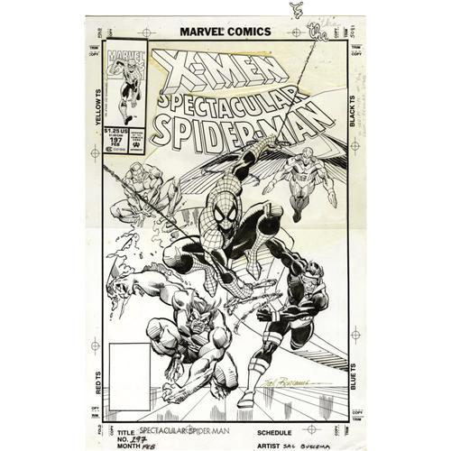 <B>Sal Buscema - Spectacular Spider-Man #197 Cover Original Art (Marvel, 1993).</B></I> Make yours Marvel with this spectacular Sal Buscema blockbuster. Your friendly neighborhood Spider-Man leads the charge with the uncanny X-Men at his heels. Cyclops, the Beast, Ice Man, and the Angel -- what a strike team! This modern sensation is another triumph for Marvel mainstay, Sal Buscema. The image area of this cover is 9.5" x 15". The title logo and a re-sized Angel figure are statted elements on an acetate overlay; otherwise, the art is in Excellent condition. <BR><BR><b>Shipping:</b> Flat Material, Small (<a target="_blank" href="http://www.heritageauctions.com/common/shipping.php">view shipping information</a>)