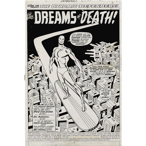 <B>Sal Buscema and Frank McLaughlin - The Defenders #6 Splash Page 1 Original Art (Marvel, 1973).</B></I> Today, the Silver Surfer rejoins the world! Legend makers Sal Buscema, and Frank McLaughlin spread the thrilling news to Marveldom Assembled in the sterling splash page from "The Dreams of Death." The image area of this splash measures 10" x 15", and aside from some printer's oil staining along the left and right edges, and a tape stain on a word balloon, the art is in Very Good condition. <BR><BR><B>Important notice:</B> Heritage usually auctions material at the rate of 200-250 lots per hour. On some occasions eBay Live bid software or the Internet may not be able to keep up with the pace of the auction. We recommend placing a realistic absentee bid now as insurance to avoid disappointment. Occasionally the auctioneer may eliminate or reject an eBay Live bid, and the auctioneer may also reopen a lot after the close of the eBay live bidding (usually because we missed an audience bid), and may reject your bid even if it shows you as the winning bidder. By bidding via eBay Live, you agree that Heritage may award the lot to another bidder at its sole discretion under the circumstances described above or any other reasonable circumstances. Since eBay bids are not shown to us until we open the lot on the floor, we treat those bids just like floor bids. In most cases the floor responds before the eBay bid is presented to us, due to Internet lag time, so for consistency we have made it a policy that floor bids are always considered first over tie eBay live bids. Also please note that all Heritage lots purchased through eBay Live carry a 22.5% Buyer's Premium. Please make sure you read the Terms and Conditions before you bid. This lot is being auctioned in conjunction with a live floor auction by Heritage Auction Galleries. All final auction and invoice information will be supplied by Heritage Auction Galleries, and all other information should be considered preliminary. Lot:41001 <BR><BR><B>Winning Notification and Billing:</B> After the FINAL session in this auction is complete, Heritage will send e-mail and snail mail invoices. This process normally takes several days. All final auction and invoice information will be supplied by Heritage Auction Galleries, and all other information should be considered preliminary. <BR><BR>This auction will be conducted on a live auction floor and over the Internet through eBay Live. If you choose to place an absentee bid, please take a moment to <font color='#0000ff'><u><a href='http://pages.ebay.com/liveauctions/help/before/laabsentee.html'>learn how eBay Live absentee bidding works</a></u></font><font color='#000000'>