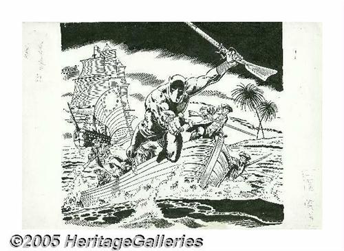 <B>Sal Buscema (attributed) - Mighty Marvel Bicentennial Calendar Black Panther Illustration Original Art (Marvel, 1976).</B></I> The Black Panther spearheads the never-ending fight for freedom as he leads a band of American patriots ashore on a charge from a longboat -- it's the American Revolution, Mighty Marvel style! The image area of the illustration is 12" x 11.5", and aside from a small stain at the lower right, the art is in Excellent condition.