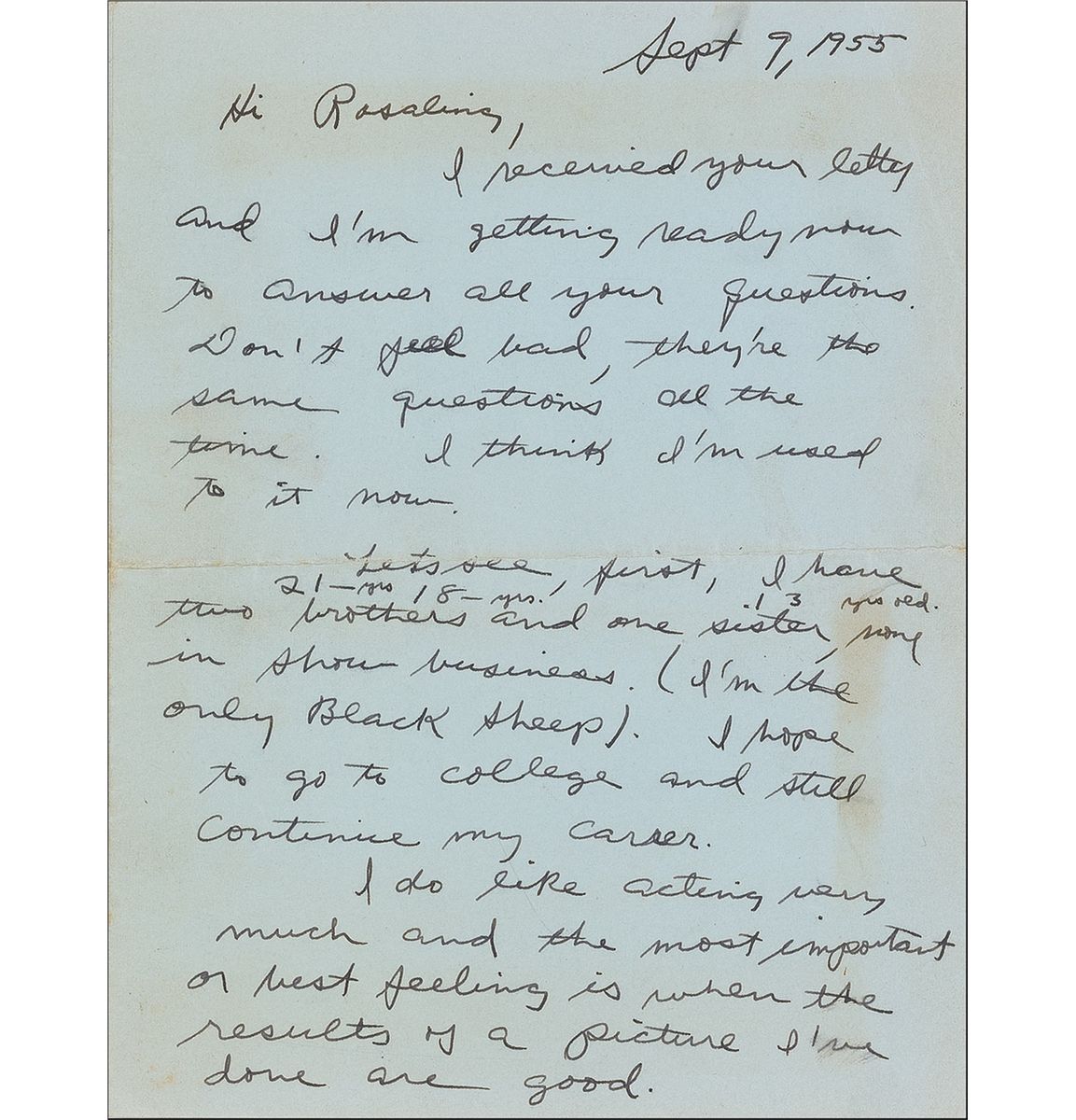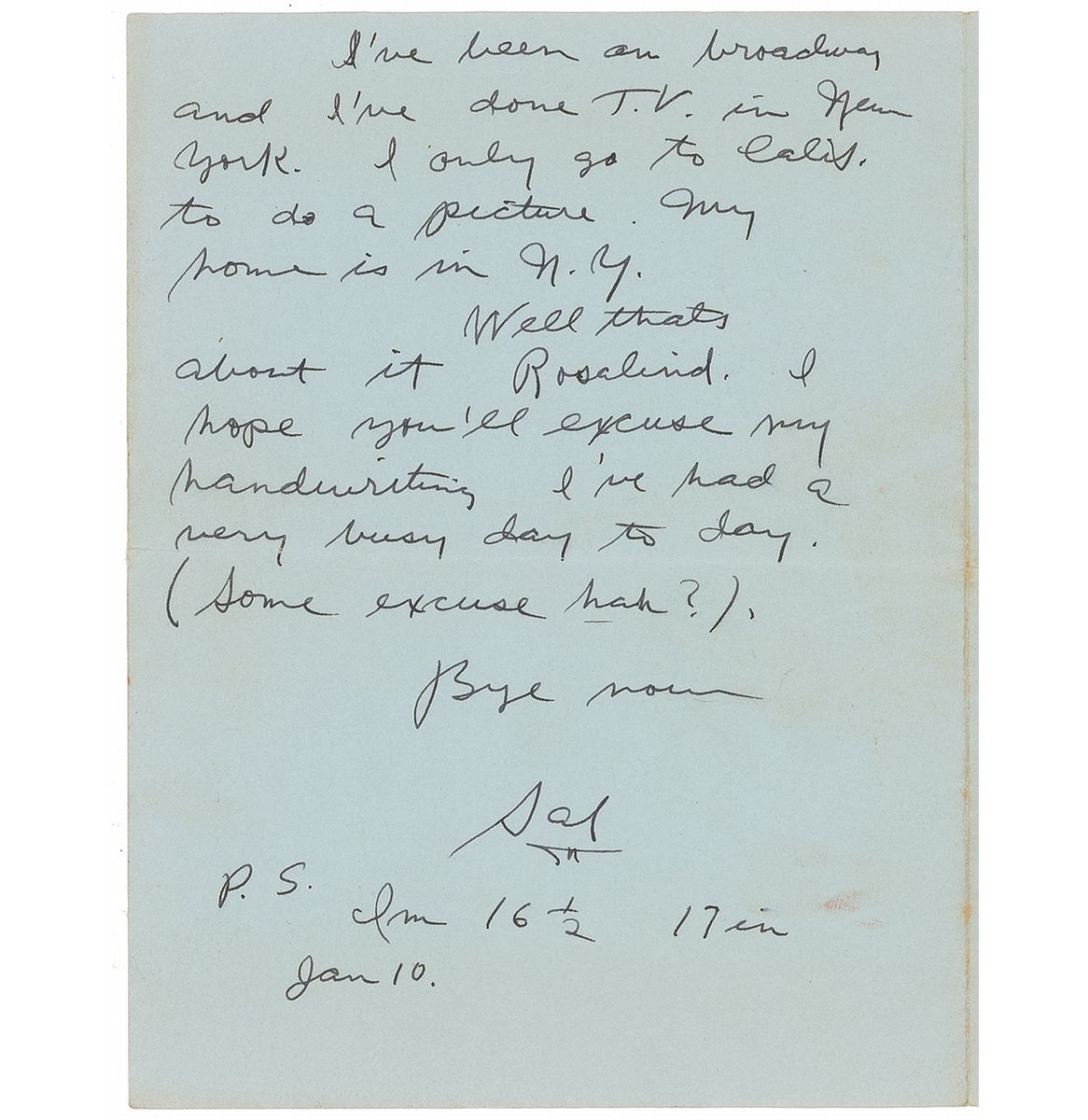 Actor tragically stabbed to death at the age of 37 in February 1976, best remembered for his roles in Rebel Without a Cause, Giant, and Exodus. ALS signed “Sal,” two pages on two adjoining sheets, 5.5 x 7, September 9, 1955. At 16 years of age, Mineo responds to an admirer named “Rosalind,” in full: “I received your letter and I’m getting ready now to answer all your questions. Don’t feel bad, they’re the same questions all the time. I think I’m used to it now. Let’s see, first, I have two brothers and one sister (21 years, 18 years, 13 years old), none in show business. (I’m the only black sheep). I hope to go to college and still continue my career. I do like acting very much and the most important or best feeling is when the results of a picture I’ve done are good. I’ve been on Broadway and I’ve done T. V. in N. Y. I only go to Calif. to do a picture. My home is in N. Y. Well, that’s about it Rosalind. I hope you’ll excuse my handwriting. I’ve had a very busy day to day. (Some excuse, huh?),” adding the post script, “I’m 16 1/2, 17 Jan 10.” Scattered light creasing and toning, otherwise fine condition. Accompanied by the original mailing envelope, addressed in Mineo’s hand, and a candid, unsigned photo. The 1955 film earned Mineo one of his two Academy Award nominations for Best Supporting Actor as John “Plato” Crawford; the next would be for his role as Dov Landau in Exodus.