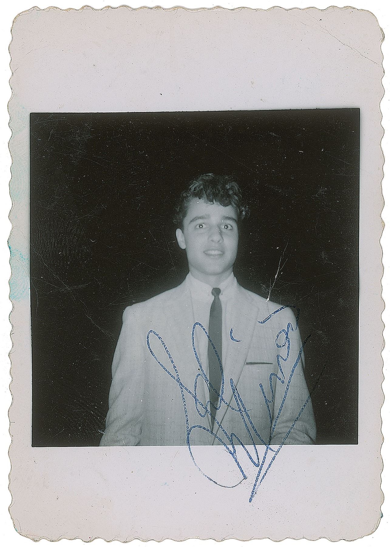 Vintage glossy 2.5 x 3.5 candid photo of Mineo in a handsome suit and tie, signed in blue ballpoint. Reverse bears a collector's date notation of May 23, 1956. In fine condition, with a few creases and some skipping to ink. From the Harvey and Rhoda Kuflik Collection.