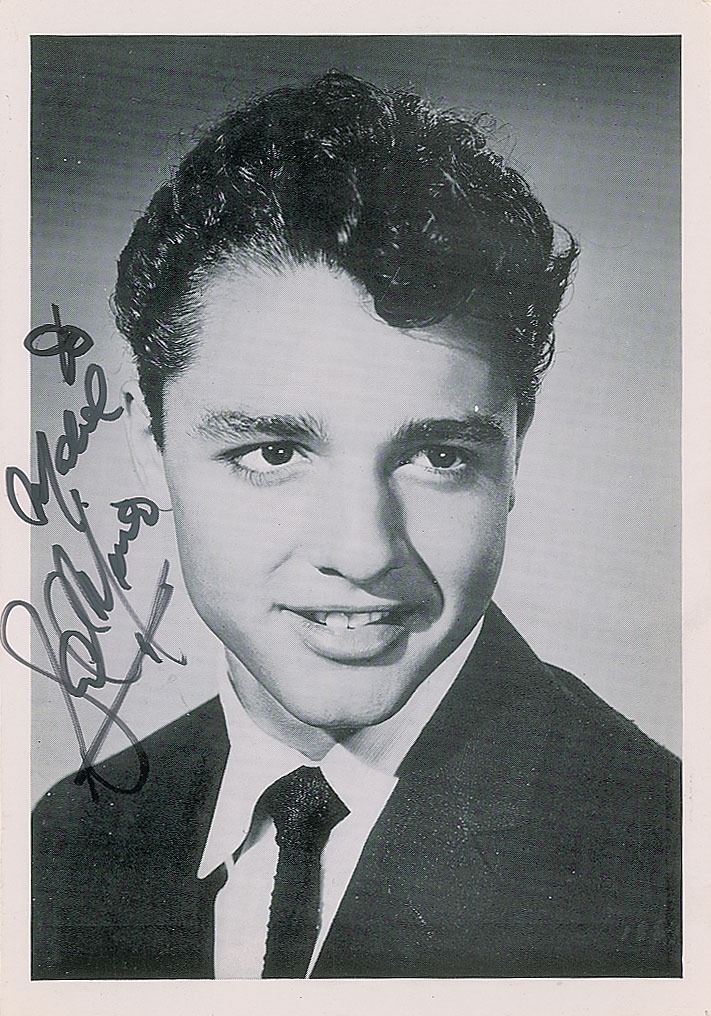 Actor (1939–1976) best known for his performance opposite James Dean in the 1955 classic Rebel Without a Cause. Vintage 5 x 7 cardstock photo of Mineo in a suit and tie, signed and inscribed in black felt tip, "To Mabel, Sal Mineo.” In fine condition.