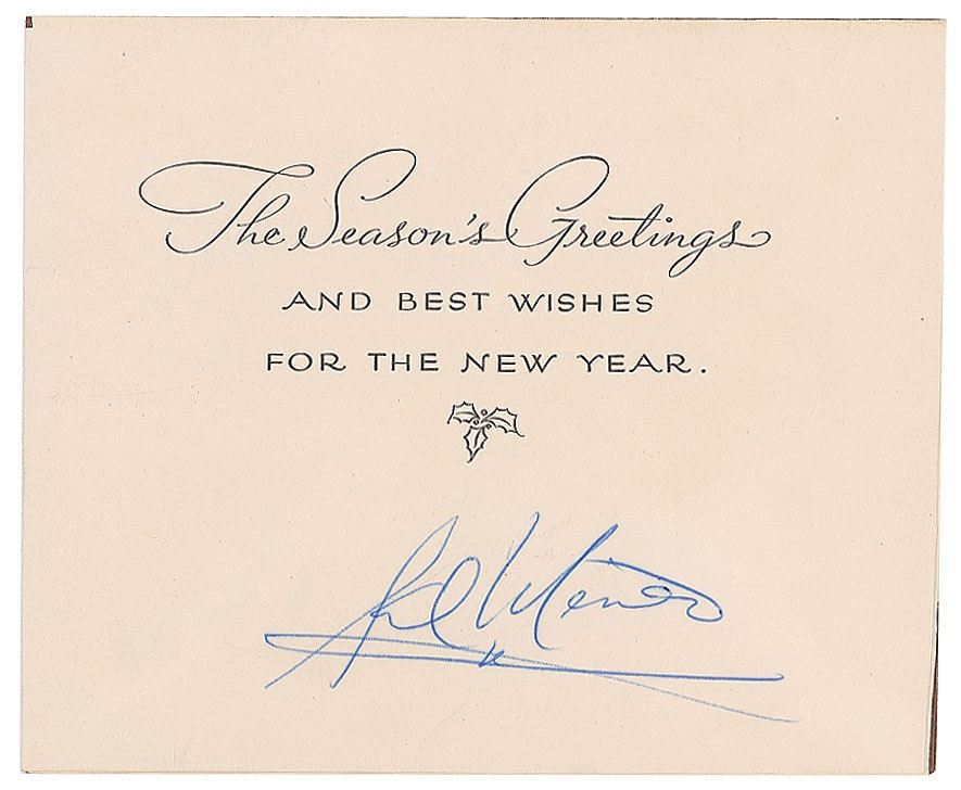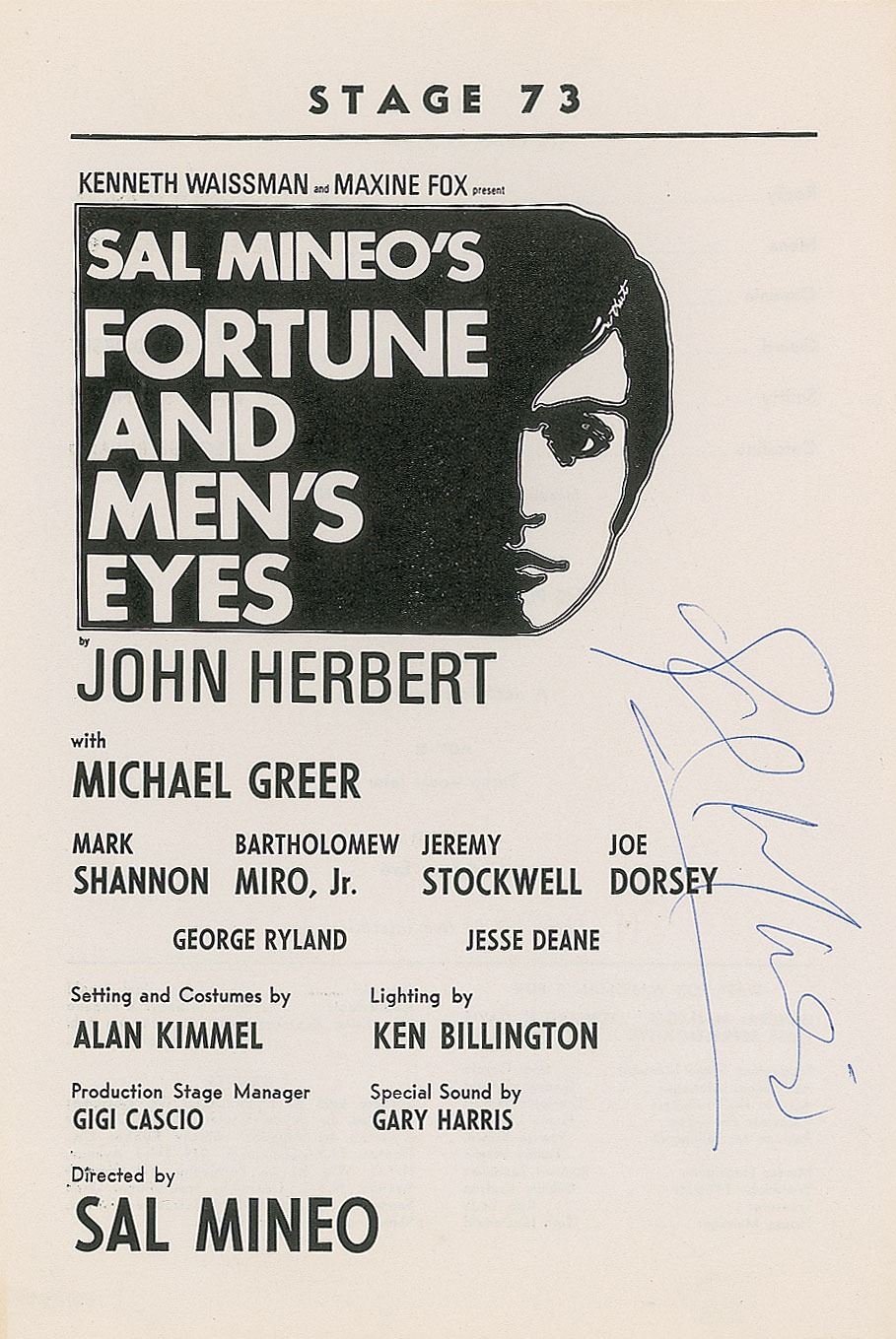 Two items signed by Sal Mineo: a color 5.5 x 4.5 Currier & Ives season's greetings card, signed inside in blue ballpoint by Mineo; and a 6 x 9 handbill for the play Fortune and Men's Eyes, signed in blue ballpoint by Mineo. In fine condition. Accompanied by two small promo photos.