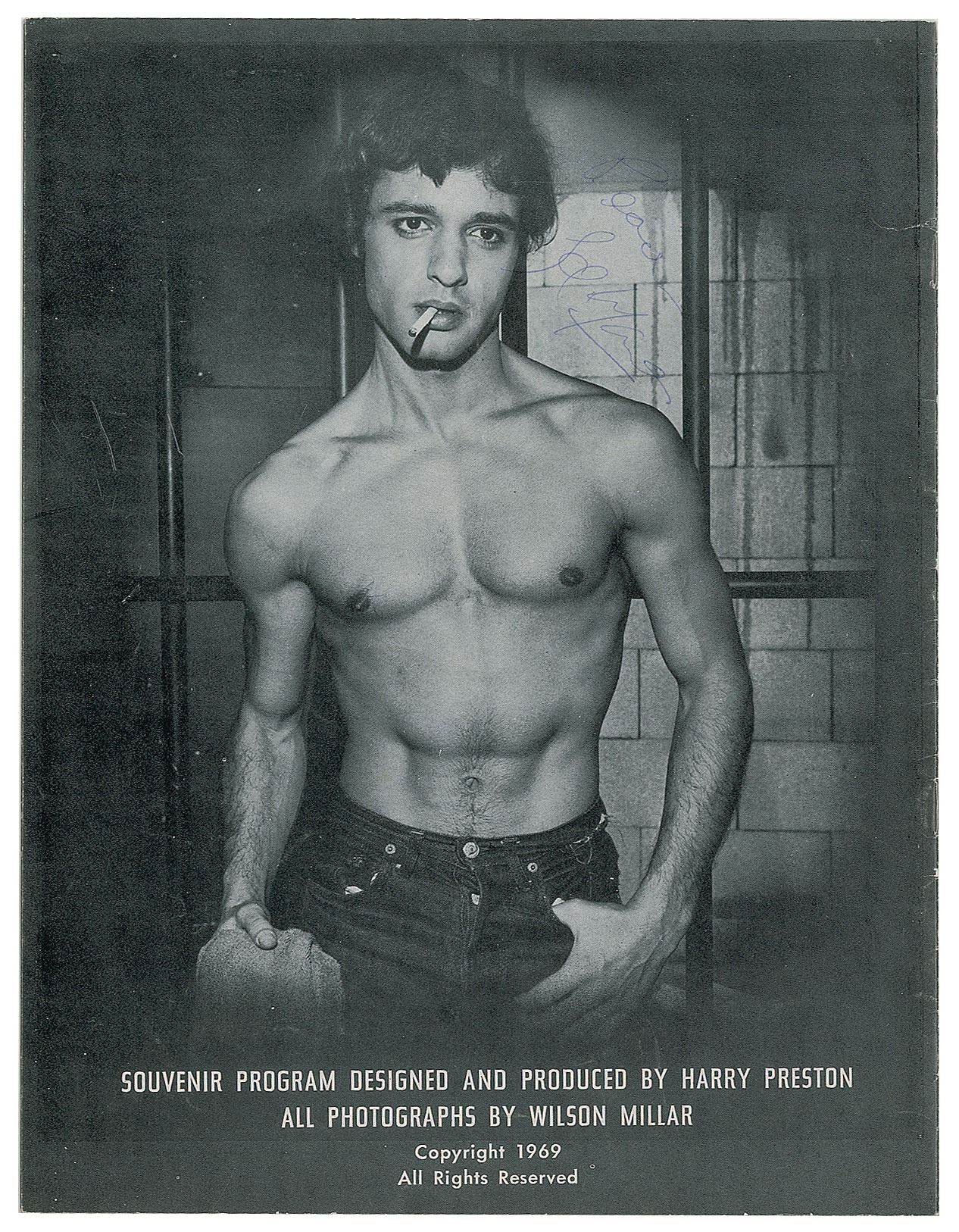 Souvenir program for the play Fortune and Men's Eyes from 1969, twelve pages, 8.25 x 11, signed on the back cover in blue ballpoint, "Peace, Sal Mineo." In very good to fine condition, with general handling wear and a light vertical bend.