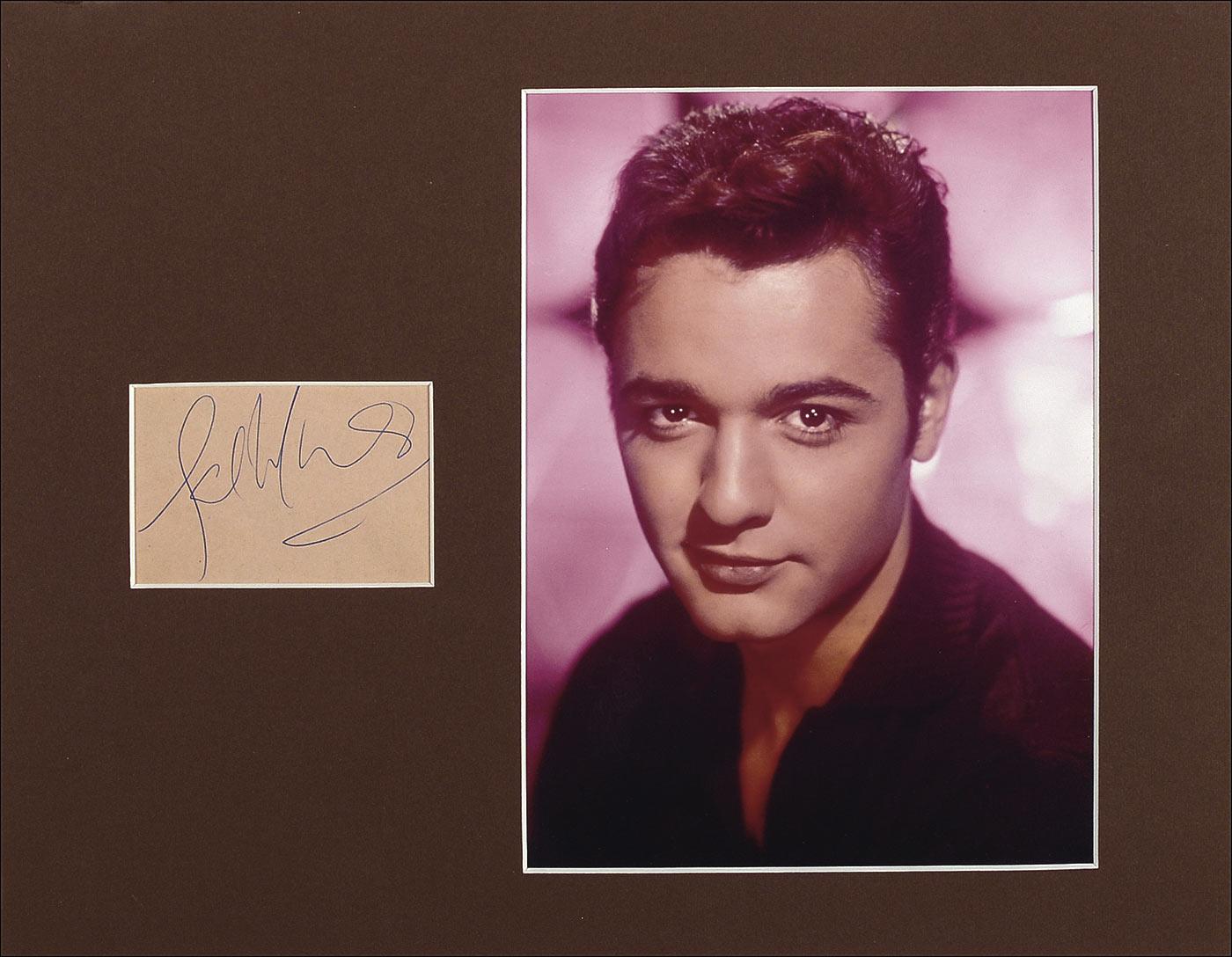 Vintage ballpoint signature, “Sal Mineo,” on a beige album page. Matted with a handsome color portrait, to an overall size of 14 x 11. In fine condition, with some light impressions from signature on reverse. Pre-certified PSA/DNA and RRAuction COA.