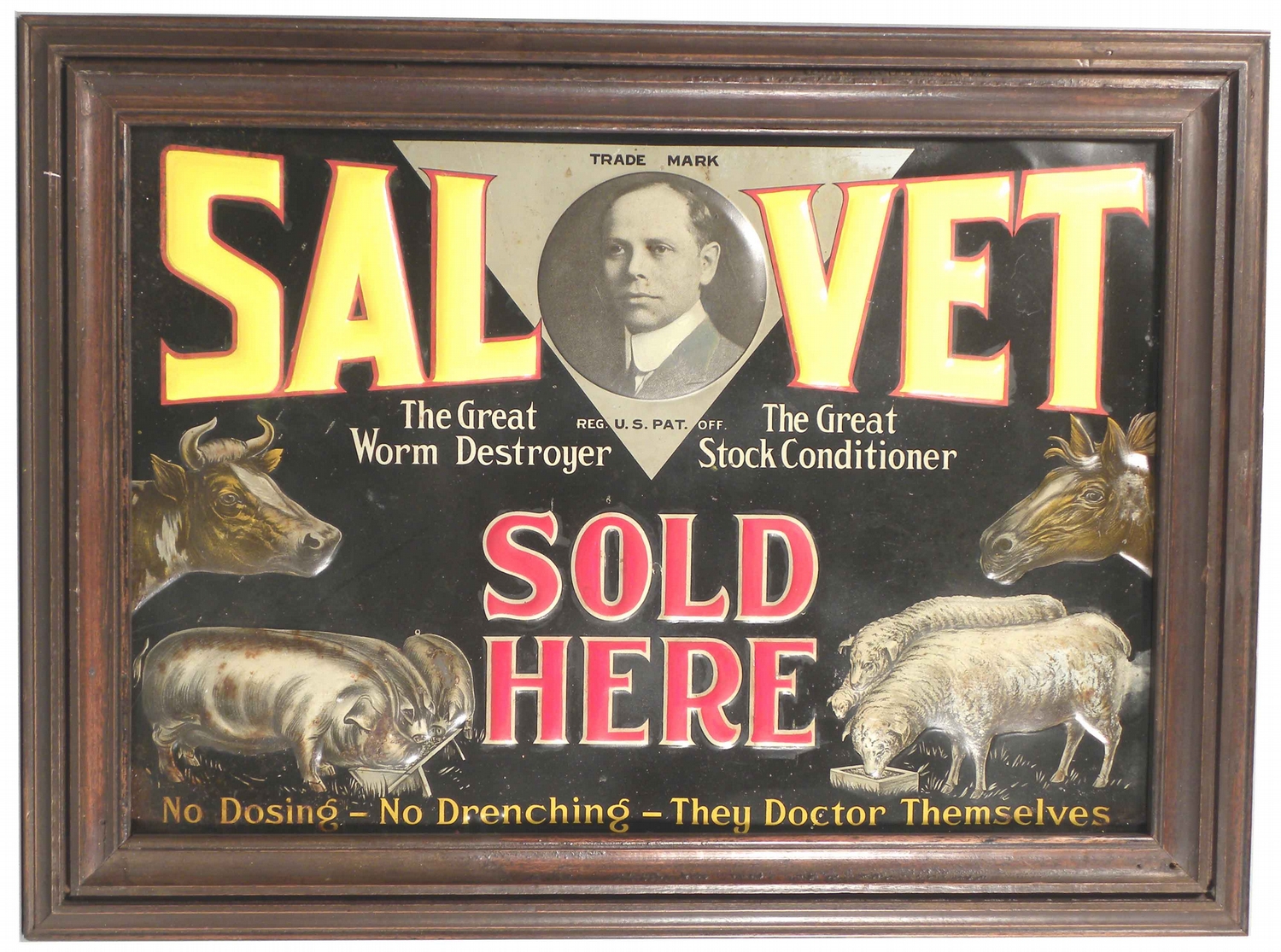 Sal-O-Vet Embossed Tin Sign. The Greatest Worm Destroyer and Stock Conditioner. Excellent condition. 19 X 13 inches image only.