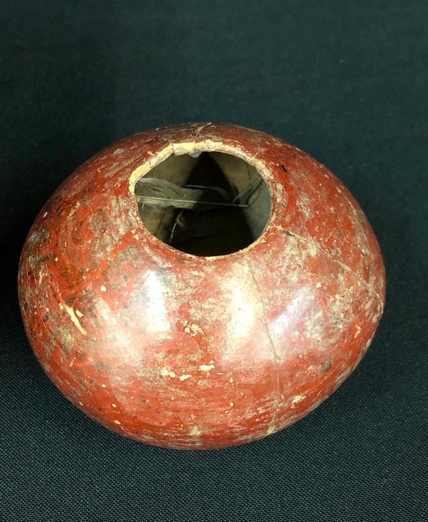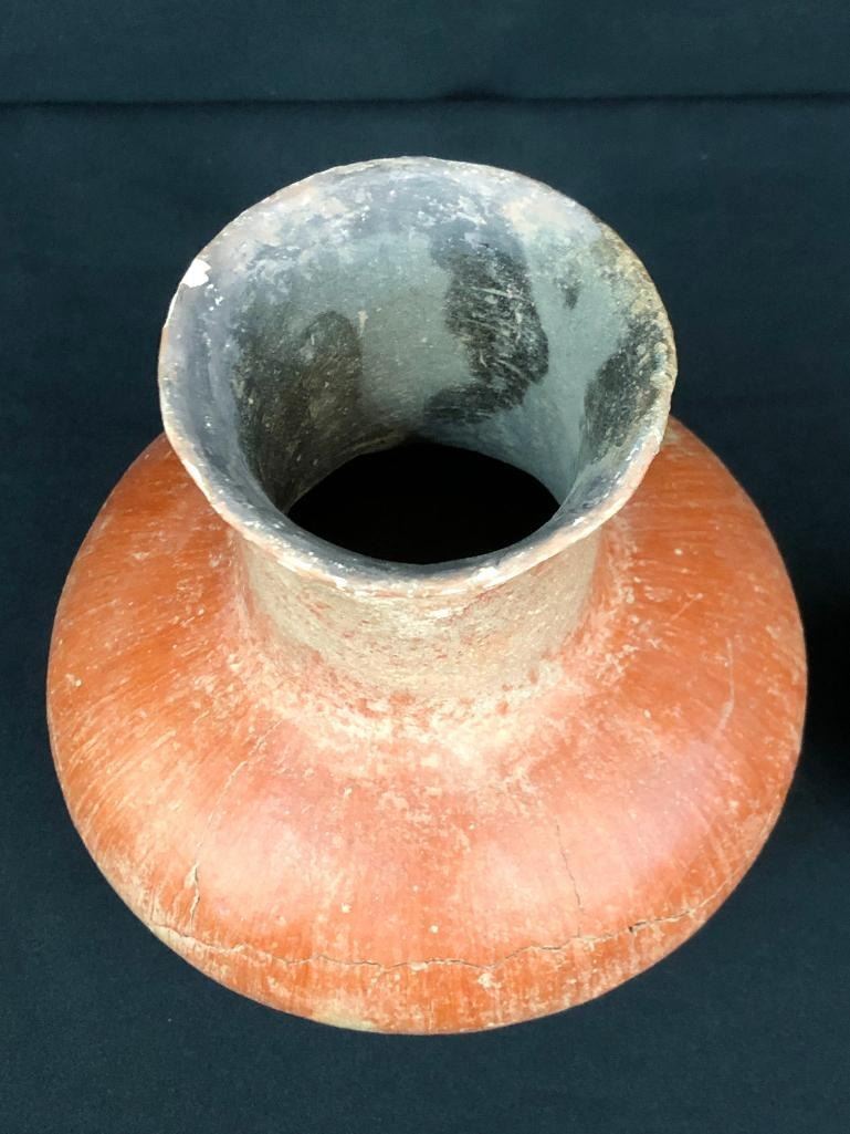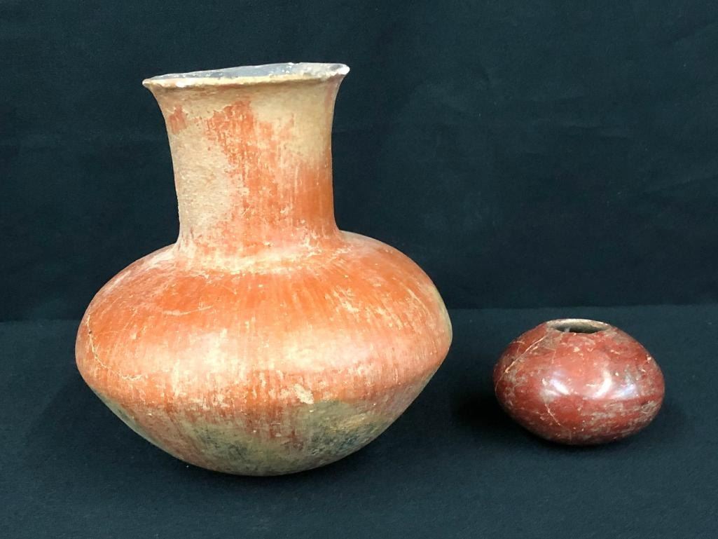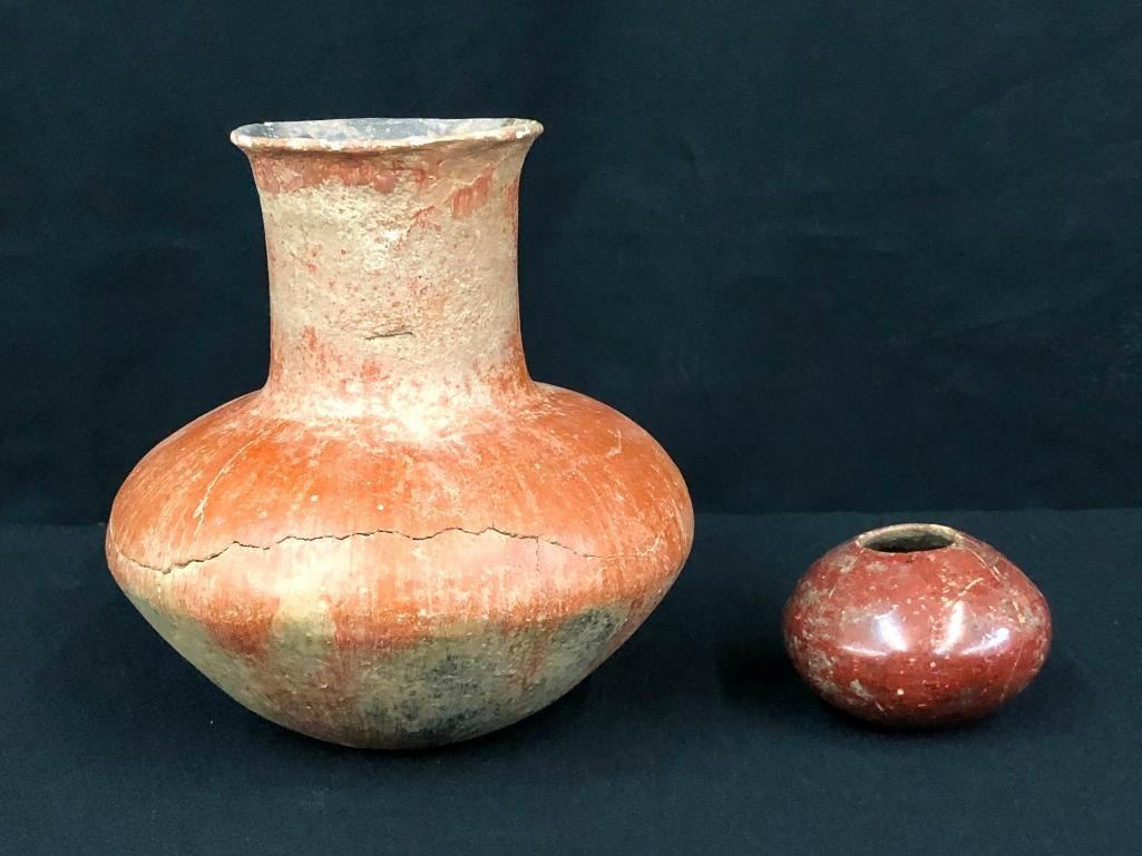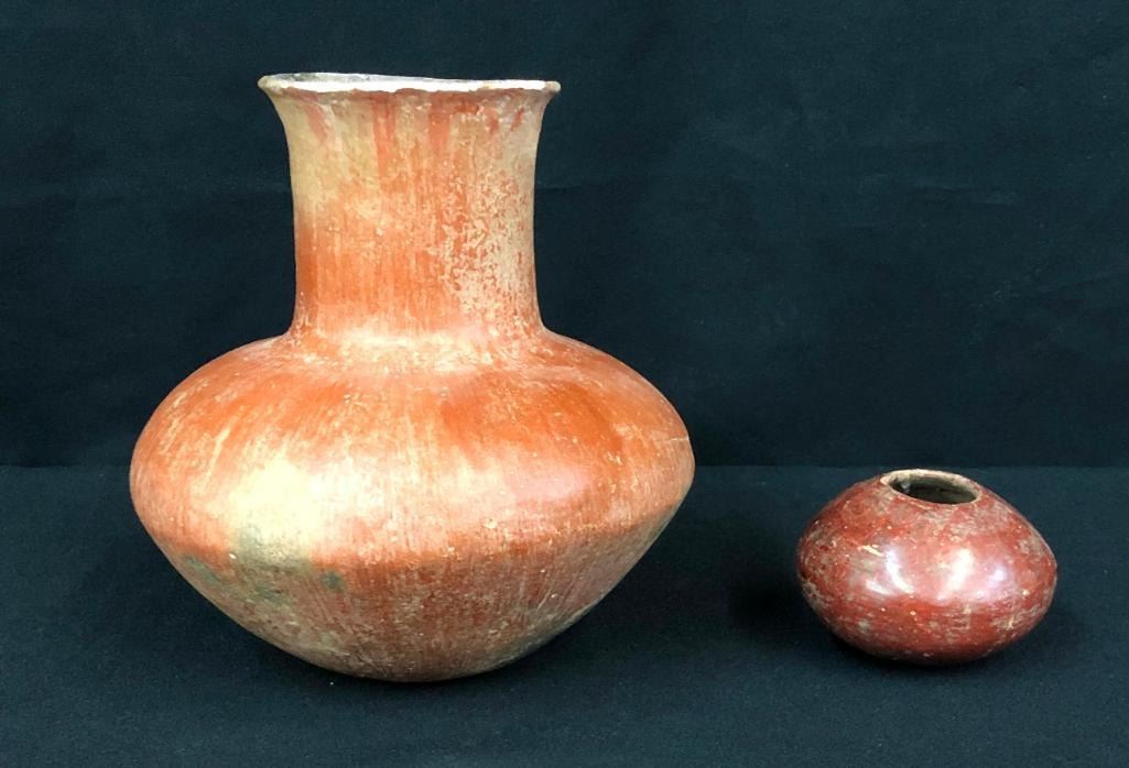 Included for sale in this lot is a nice, older Salado long neck jar and a small Hohokam pot. These items are in good condition for their age and would make a great addition to your collection. This pottery was originally from the Hinkley / Sipes collection, a well documented collection of prehistoric pottery and artifacts from Arizona. MAKER: Unmarked. APPROX AGE: Prehistoric. SIZE: 6-1/2 inches wide X 7 inches tall. 3 inches wide X 2-3/8 inches tall. CONDITION: As found, some restoration may be present. Please look closely at the pictures as they are an important part of our description and are hereby incorporated into the description, specifically with regards to condition. SHIPPING: There will be a $10 handling / packaging fee for shipping this lot. The actual cost of postage will be added on top of that. BUY IT NOW: If you would like to buy this item now, without waiting for the auction day to bid on it, we do offer this option (which is available up to 48 hours before the actual auction starts). The “Buy it Now” price is the high estimate of this lot (plus applicable fees and the Buyer's premium is discounted to 10% when using the Buy it Now option). If you would like to exercise this option, you must contact us by email (or phone as long as you talk to someone live). Reference this lot number and your intention to "Buy it Now."