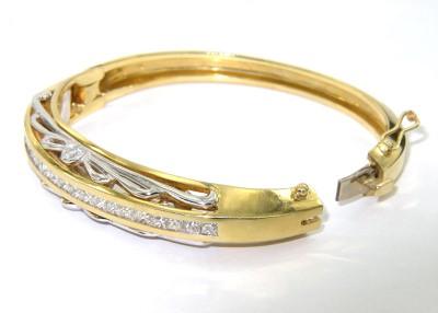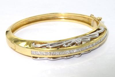 Salavetti 18K Yellow Gold Diamond Bangle. The total bangle's weight is 52.9 grams. The total weight of 20 princess cut diamonds are 2 cts,approxmiately. G color VS clarity. The measurement of bangle: 51 x 45 mm. The bangle is 11 mm wide and 3 mm in thickness