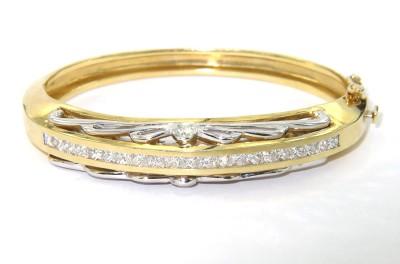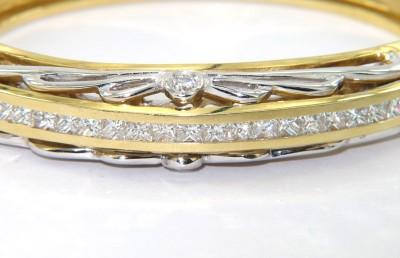 Salavetti 18K Yellow Gold Diamond Bangle. The total bangle's weight is 52.9 grams. The total weight of 20 princess cut diamonds are 2 cts,approxmiately. G color VS clarity. The measurement of bangle: 51 x 45 mm. The bangle is 11 mm wide and 3 mm in thickness