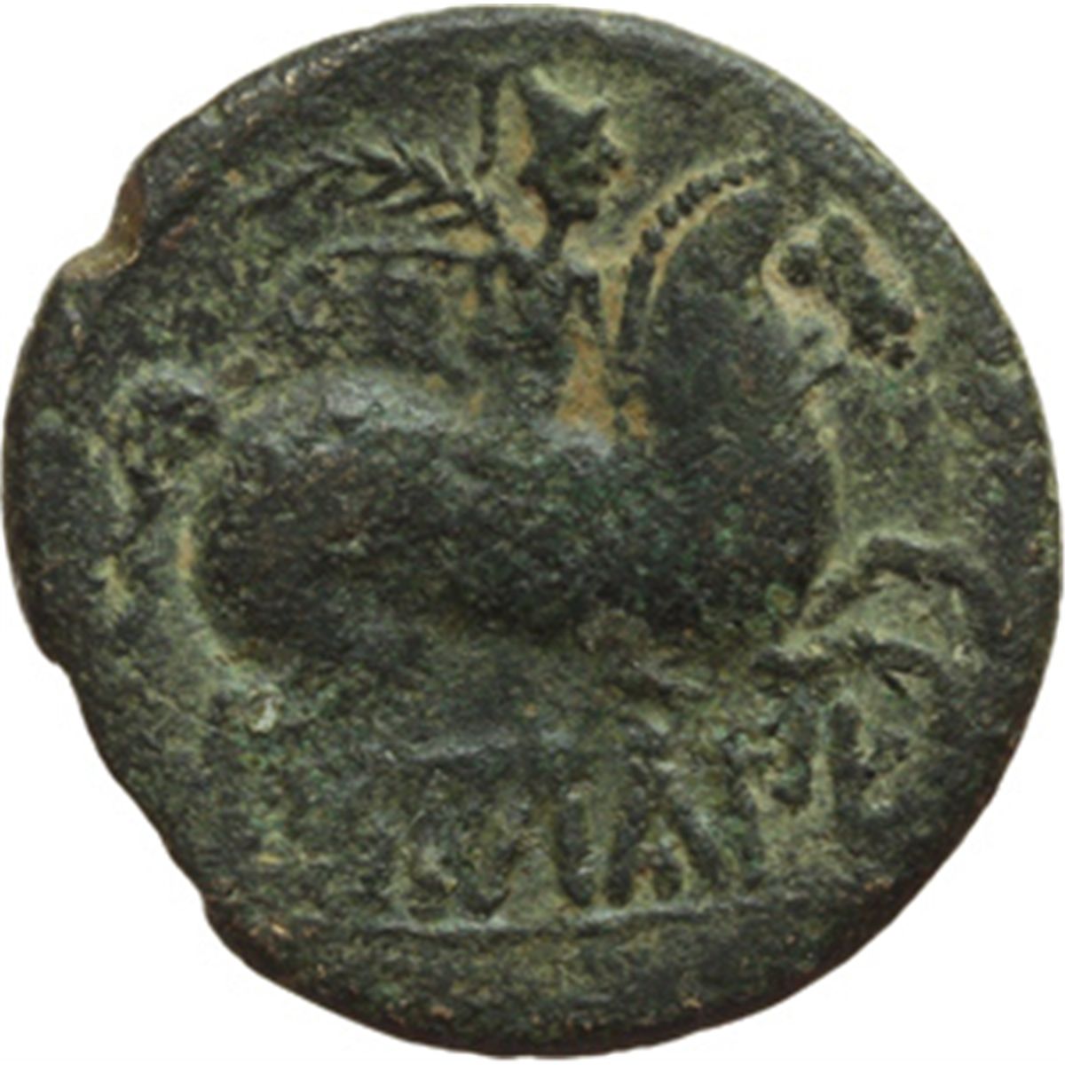 Mondo Greco. Hispania. Salduie. AE 25mm. 120-80 a.C. D/ Testa virile imberbe a destra. Intorno, tre delfini. R/ Cavaliere con ramo di palma che galoppa a destra. Sotto, legenda iberica SALDuIE. Burgos 698. AE. g. 9.30 mm. 25.00 Patina verde. BB.