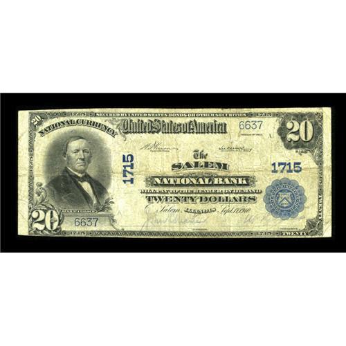 <B>Salem, IL</B></I> - $20 1902 Plain Back Fr. 653 <B>The Salem NB</B></I> Ch. # 1715<BR>CAA last sold this note in January 2001. Signatures are barely legible on this <B>About Fine</B></I> example.<BR><I>From The Lincoln Collection</B></I><BR><BR><b>Shipping:</b> Coins & Currency (<a target="_blank" href="http://www.heritageauctions.com/common/shipping.php">view shipping information</a>)