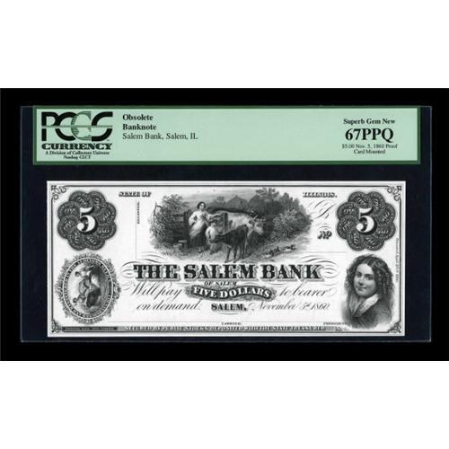<B>Salem, IL- The Salem Bank</B></I> $5 Nov. 5, 1860 G8 Proof <BR> This still-born bank has only two denominations listed in Haxby and both have the "NDA" acronym, <I>No Description Available. </B></I>Circulating notes were printed, but not issued to the bank. They were all destroyed leaving behind only Proofs. None of the Proofs had surfaced by the 1988 publishing date of the Haxby opus. This is our first encounter with a Proof from this bank and it is a beauty grading <B>PCGS Superb Gem New 67PPQ </B></I>mounted on card.<BR><BR><b>Shipping:</b> Coins & Currency (<a target="_blank" href="http://www.heritageauctions.com/common/shipping.php">view shipping information</a>)
