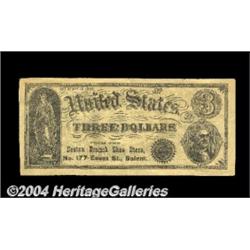 Salem, MA- Boston Branch Shoe Store $3 Ad NoteA neat $3 Ad Note using a form we've not seen previously. The date suggests an 1869 issue. Extremely Fine. <BR><BR><B>Important notice:</B> Heritage usually auctions material at the rate of 200-250 lots per hour. On some occasions eBay Live bid software or the Internet may not be able to keep up with the pace of the auction. We recommend placing a realistic absentee bid now as insurance to avoid disappointment. Occasionally the auctioneer may eliminate or reject an eBay Live bid, and the auctioneer may also reopen a lot after the close of the eBay live bidding (usually because we missed an audience bid), and may reject your bid even if it shows you as the winning bidder. By bidding via eBay Live, you agree that Heritage may award the lot to another bidder at its sole discretion under the circumstances described above or any other reasonable circumstances. Since eBay bids are not shown to us until we open the lot on the floor, we treat those bids just like floor bids. In most cases the floor responds before the eBay bid is presented to us, due to Internet lag time, so for consistency we have made it a policy that floor bids are always considered first over tie eBay live bids. Also please note that all Heritage lots purchased through eBay Live carry a 20% Buyer's Premium. Please make sure you read the Terms and Conditions before you bid. <BR><BR><B>IMPORTANT ANNOUNCEMENT ABOUT RESERVES:</B> Heritage now divulges all reserves on its web site 7 days before every auction. If you want to know whether the reserve on this lot has been met, and if not, what the reserve amount is, please visit this lot page on the HeritageCoin.com web site, or email: bid@HeritageGalleries.com