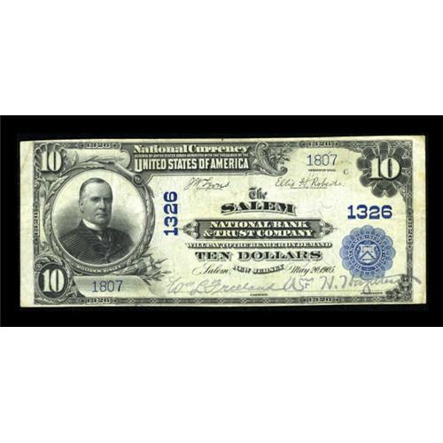 <B>Salem, NJ</B></I> - $10 1902 Plain Back Fr. 624 <B>The Salem NB & TC</B></I> Ch. # 1326<BR> A very attractive large example bearing the second title used here. Nice <B>Fine-Very Fine,</B></I>with clear signatures. <BR><BR><b>Shipping:</b> Coins & Currency (<a target="_blank" href="http://www.heritageauctions.com/common/shipping.php">view shipping information</a>)