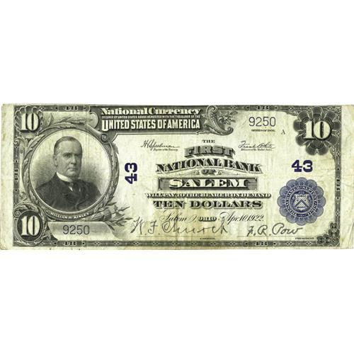 <B>Salem, OH</B></I> - $10 1902 Plain Back Fr. 635 <B>The First NB</B></I> Ch. # 43<BR>Nice stamped signatures are found on this $10 that has a little bit of soiling at bottom center. <B>Very Fine.</B></I>