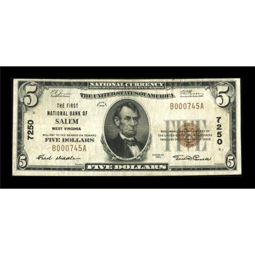 <B>Salem, WV</B></I> - $5 1929 Ty. 1 <B>The First NB</B></I> Ch. # 7250<BR> This was the only bank in this community to issue. Bright colors are visible. <B>Fine-Very Fine</B></I>.<B></B></I><BR><I>From The Kansas City Collection.</B></I><BR><BR><b>Shipping:</b> Coins & Currency (<a target="_blank" href="http://www.heritageauctions.com/common/shipping.php">view shipping information</a>)