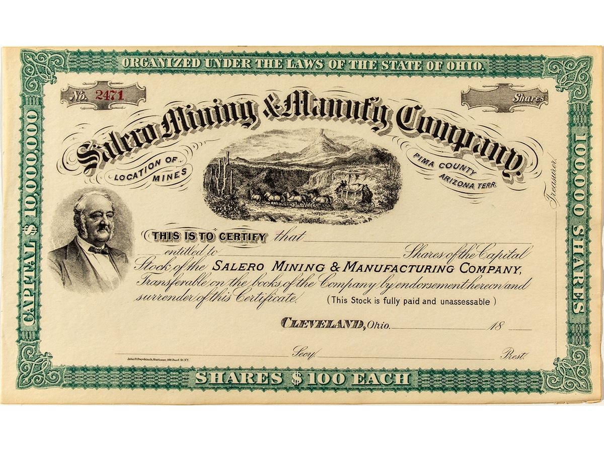 Unissued certificate # 2471 of the Salero Mining & Manuf'y Company, Arivica, c.1875. This is one of the most famous of all Arizona stocks, with a vignette of Henry Wells at left (of Wells Fargo) and a classic Sonoran desert scene of Arivaca.