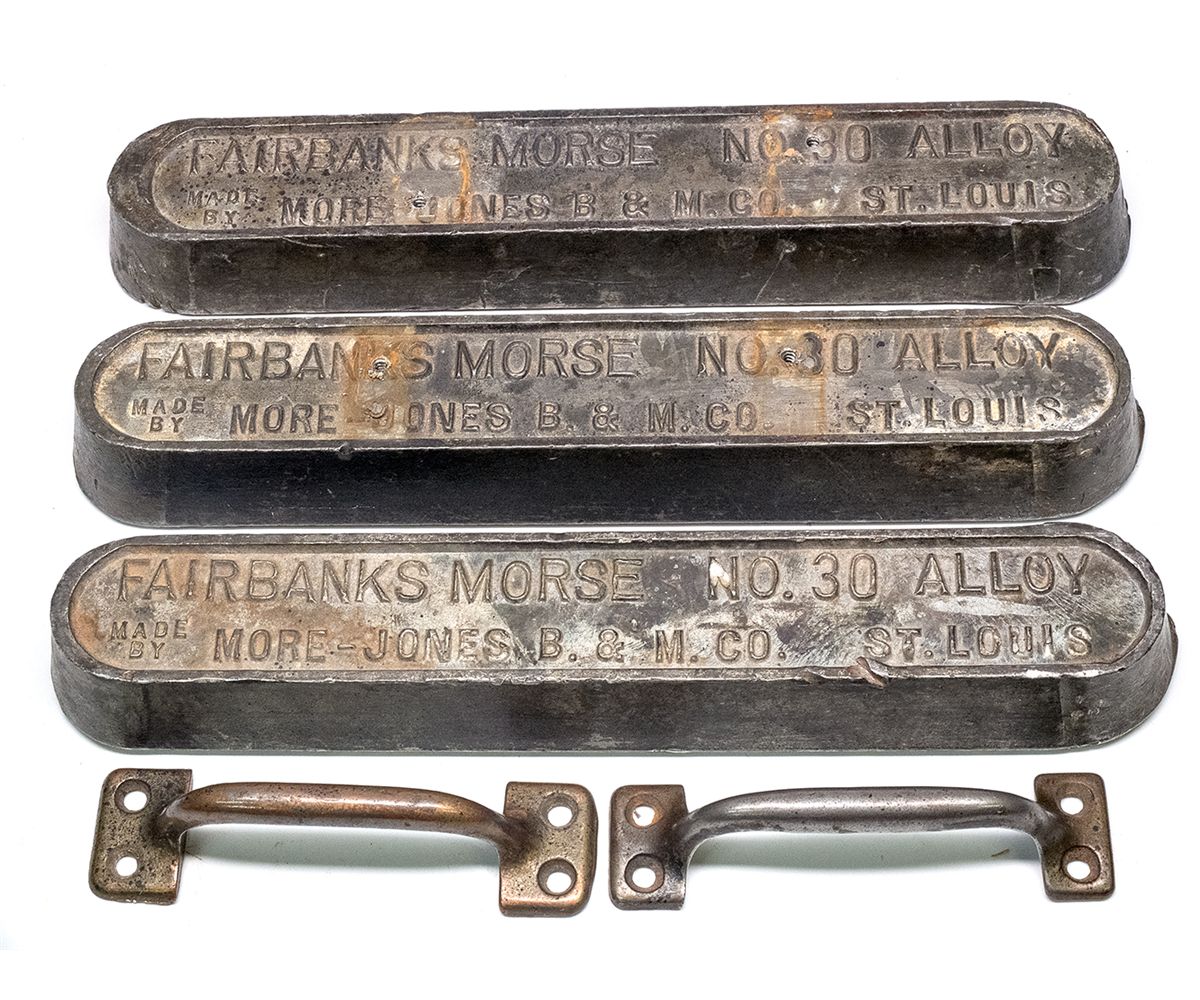 c1900 This lot consists of three metal bars, probably a salesman sample and might even could have been a Paperweight or a Repairman's Hammering Anvil for small items. They are embossed: “FAIRBANKS MORSE NO. 30 ALLOY---MADE BY MORE-JONES B. & M. CO. ST. LOUIS. Through some limited research, More-Jones was a brass and metal company that made various metal parts and specialized in railroad cars. They were listed in 1903 making Brass and Metal. Fairbanks Morse made many parts with emphasis on motors and stationary motors and other items like windmills, pumps, aviation, motorcycles, nautical. These bars measure about 9 1/4 inches long, about 1 5/8 inches wide and about 1 inch high. It has a few light dings. Bud Bassett Collection - HKA#65583