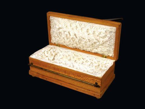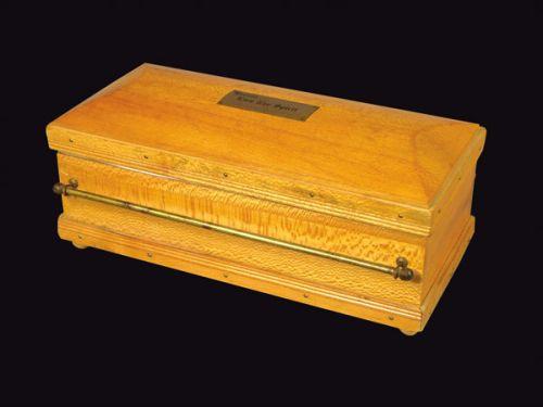 Salesman Sample Casket, Herein lies the spirit, inscribed on brass tag. 13 X 5 X 6 inches.