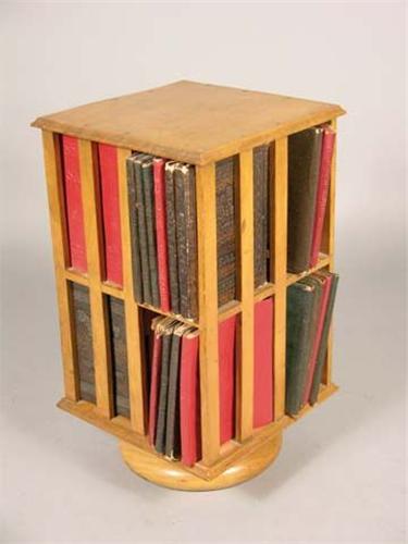 Salesman sample doll's bookcase on lazy susan with leather-bound books, 11" tall & 6" square. Ex. cond.