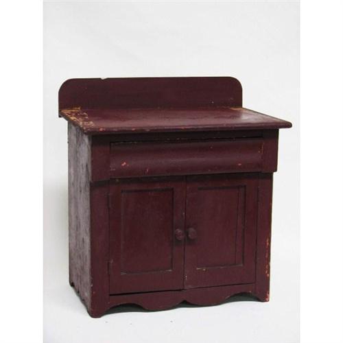 Salesman Sample Empire Chest. Origin: America, Ca. Late 19th C. Features backsplash, curved drawer over two doors, serpentine apron, wooden knobs. Hand chamfered back and drawers, square nails. 17 H x 16 W x 10 1/4 D. Provenance: City of Charleston SC Estate. Condition: shelf missing behind doors, original finish, wear commiserate with age.