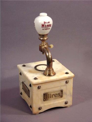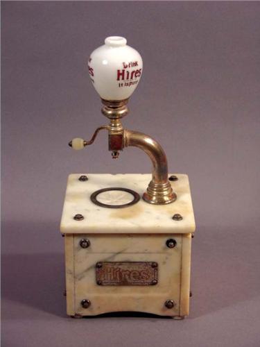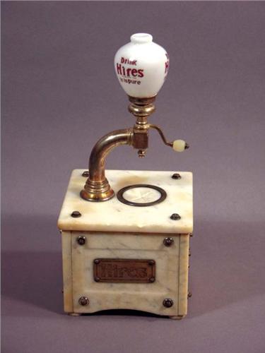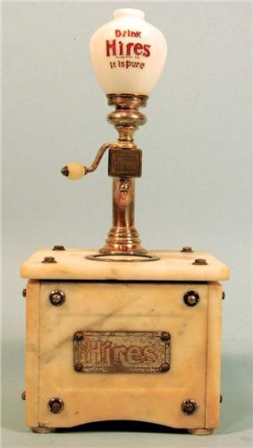 Salesman Sample Hires Root Beer Dispenser, The Money Maker. One of only two that we know of. Does not have carrying case. A must for the serious Soda Fountain Collector. Some minor chips top left edge otherwise complete original condition. 5 inches square X 10 1/2 inches tall.