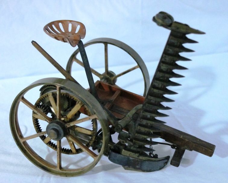 6 1/2" wide x 8" tall. Made of brass and wood. Seat appears to be cast iron.