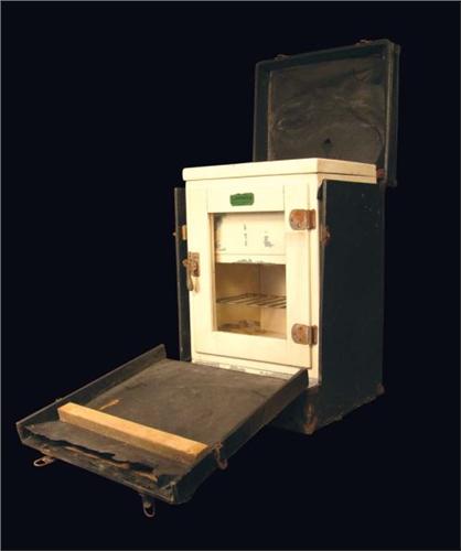 Salesman Sample Ice Box by Gordonair in original carrying case. Some paint loss to ice box and overall wear to case otherwise good condition. 12 X 17 X 11 inches.