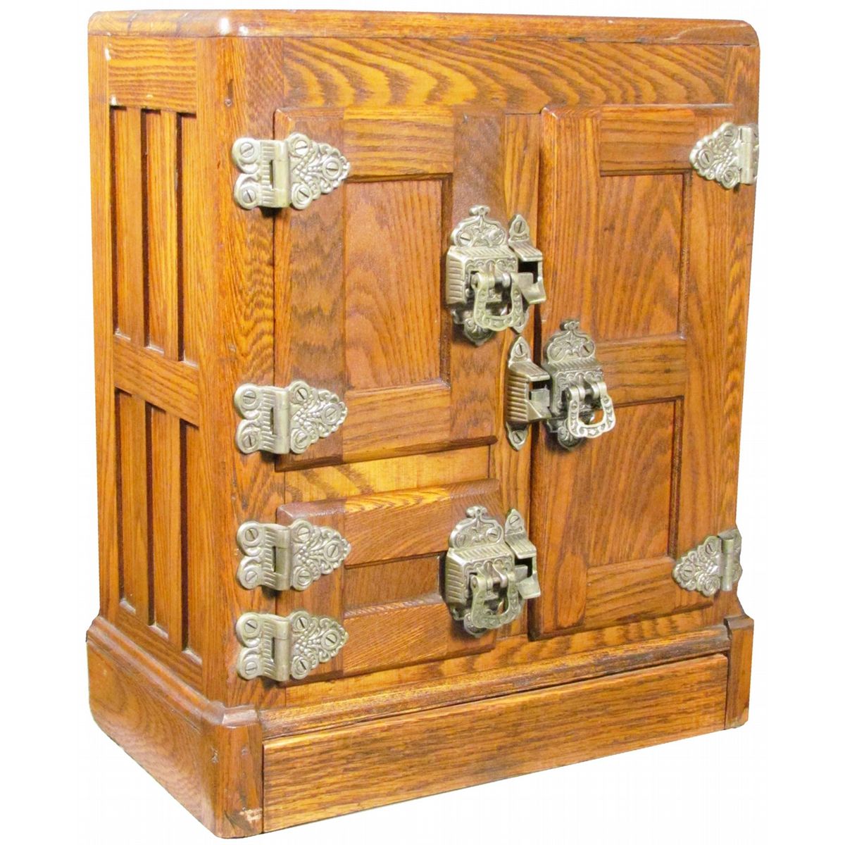 Salesman Sample Oak Ice Box. One of the best we have ever seen. Three doors in front and one in back. Nickel plated hardware with paneled oak sides and back. Excellent condition. 11 3/4 X 14 X 6 inches.
