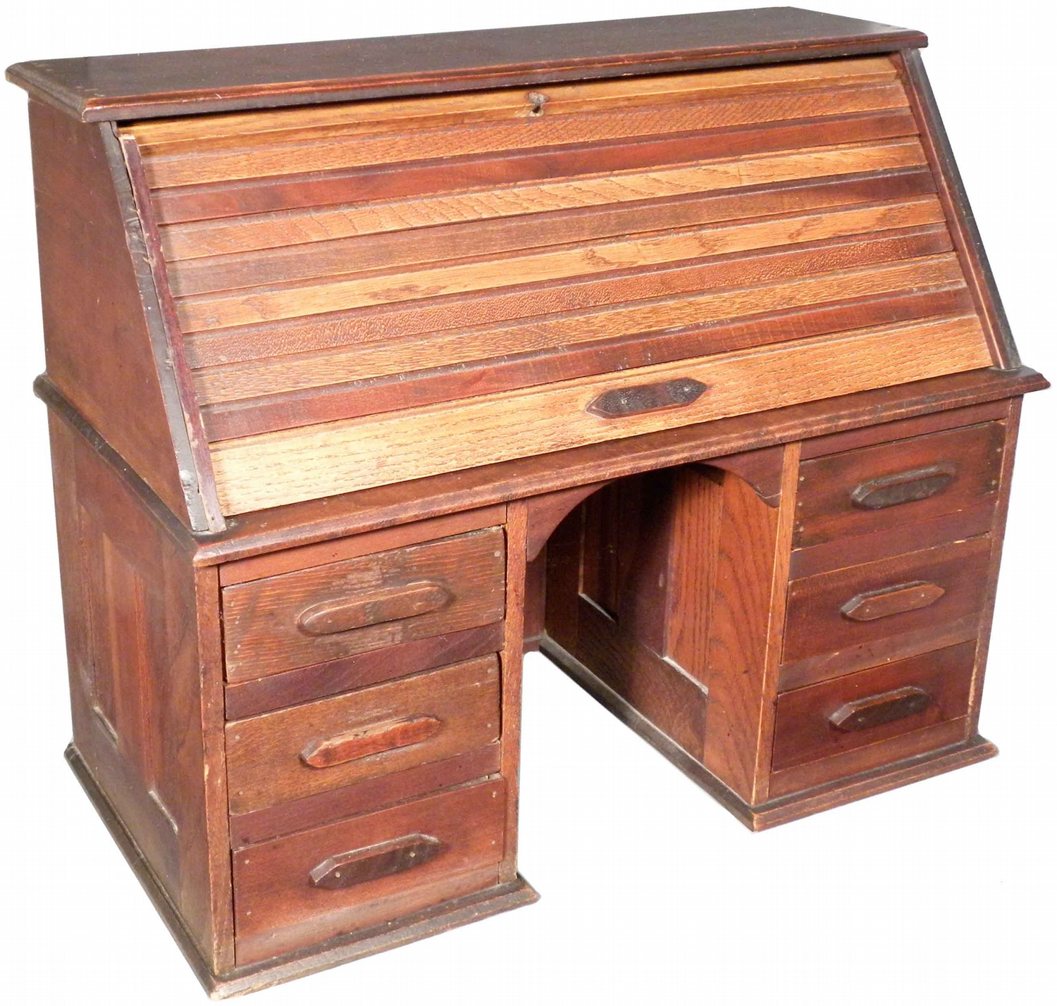 Salesman Sample No. 4 Oak Roll Top Desk. Designed and Mfg by W.J. Heath, New Boston, NH. 3 drawers on each side with interior drawer and paneled sides. Excellent condition. 18 X 15 X 9 inches.