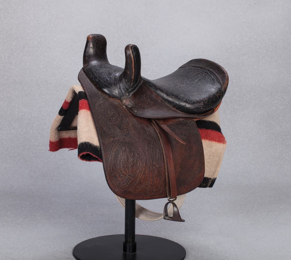 Salesman Sample Side Saddle. ?A very scarce sample or patent model saddle. Stitched brown seat, intact horn, iron heart-shaped stirrup, cotton stitched girth. Minor restoration on underside by Bill Cleaver. With saddle blanket and custom stand. 13" overall by 10" wide with an 8" seat.