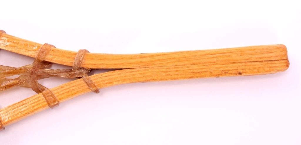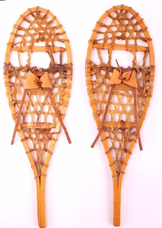 This is a pair of salesman sample snowshoes. These are an exact scale model made in the same fashion as full size snowshoes. Made from solid hardwood, these snowshoes are laced with rawhide. Each one is marked "Canada". The salesman sample snowshoes are in good condition. They measure 5" wide and 16" long.