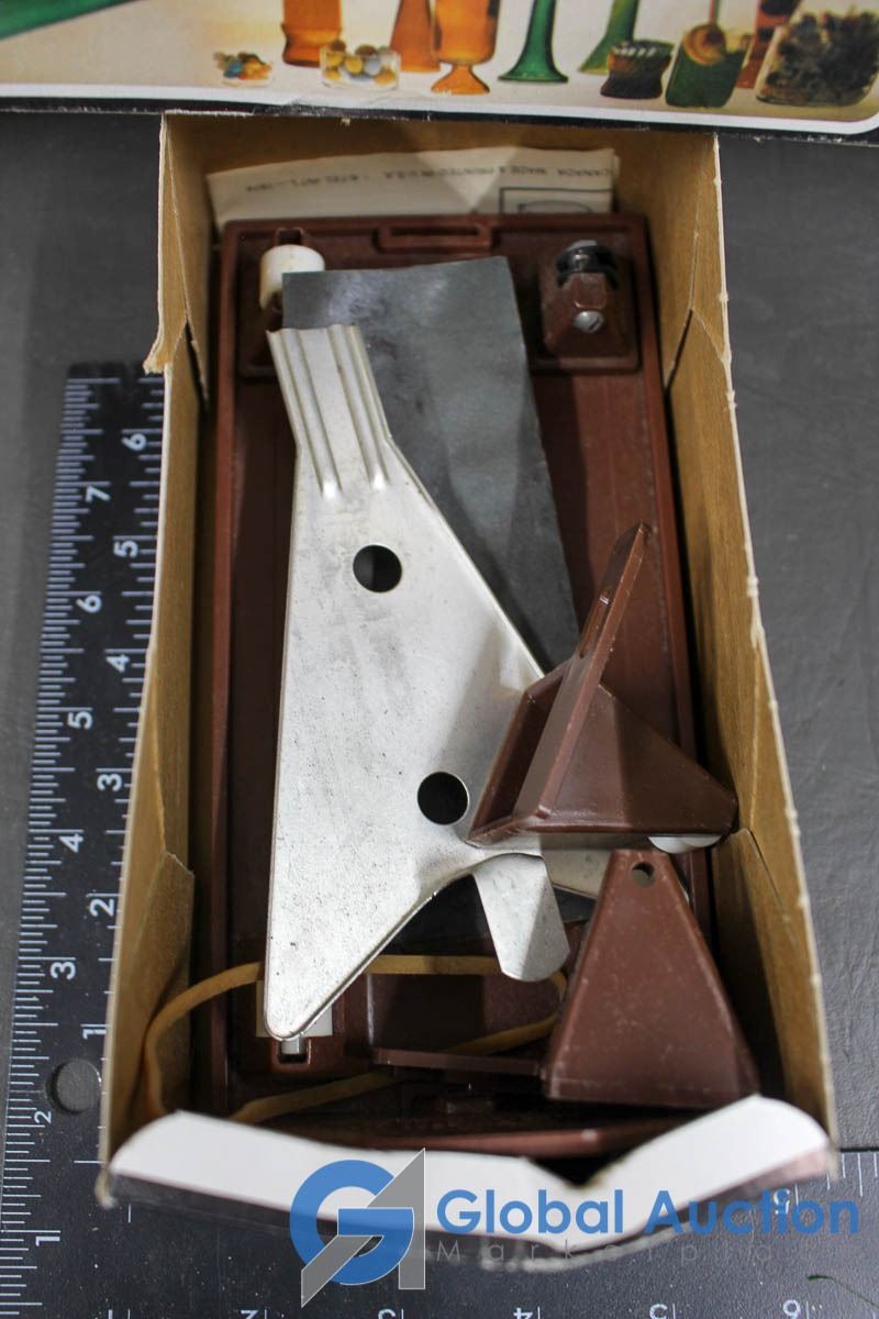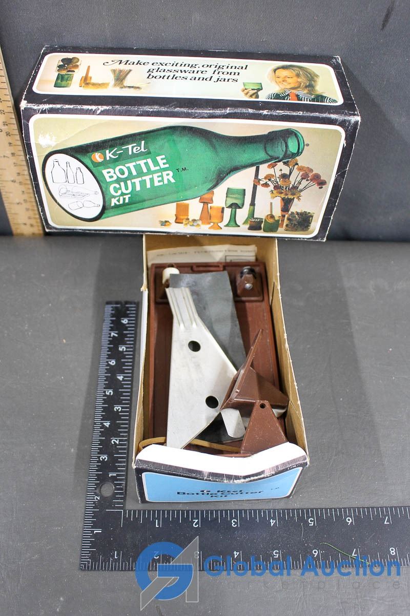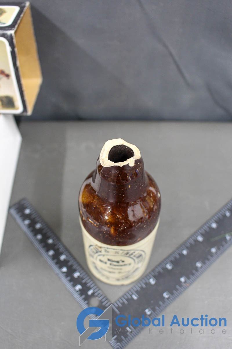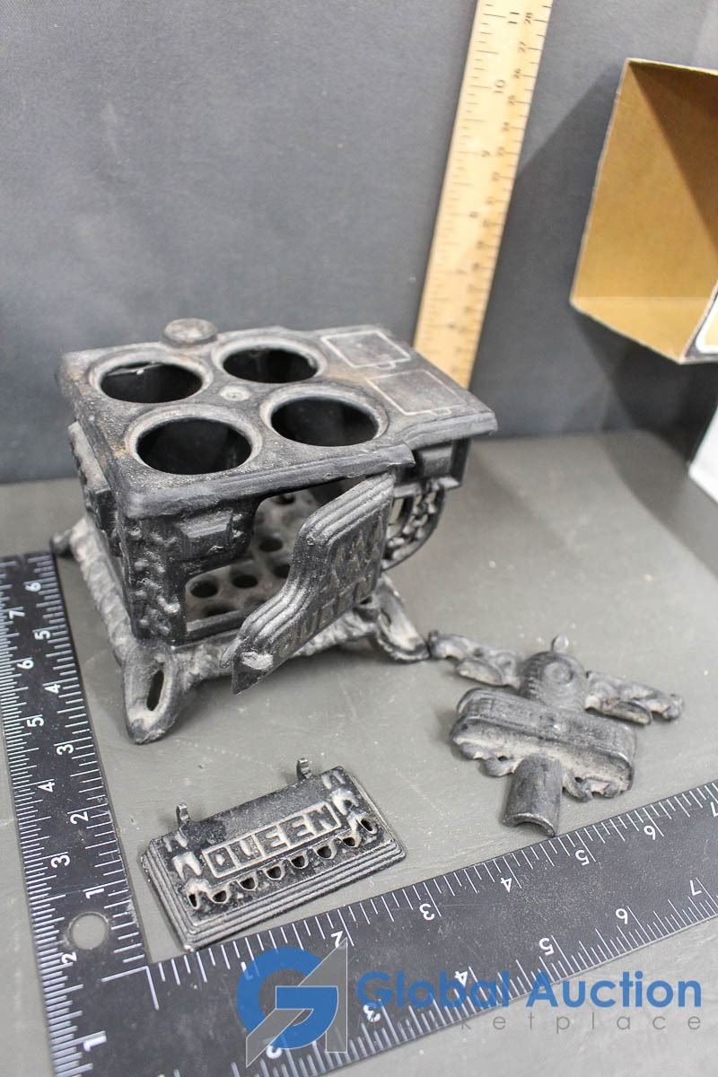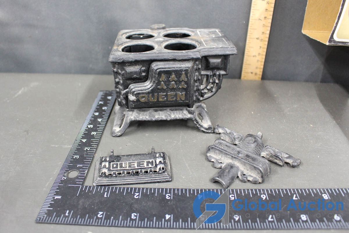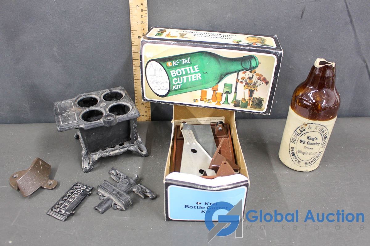 Salesman Sample Stove, K-Tel Bottle Opener Kit & Ginger Beer Bottle (Broken)