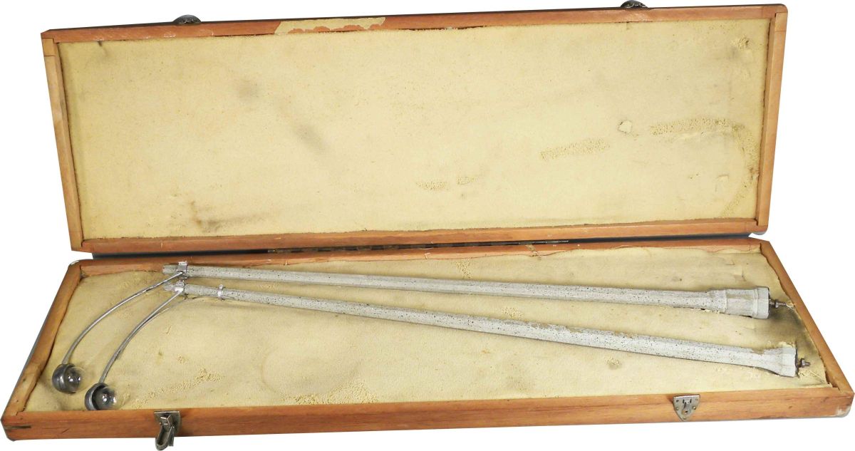 Salesman Sample Street Lamp Poles in original case. Two different styles. Electric panel plate marked AE but no other mfg. info. One arm is broken from the pole otherwise good condition. 30 inches tall.
